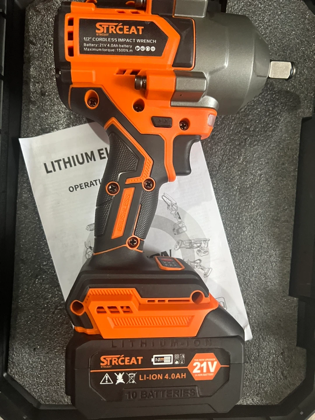 cordless impact wrench. It's powered by a 21V Lithium-ion 4.0Ah battery. This kit includes the impact wrench, a battery, a charger, and a carrying case. The tool features a brushless motor for efficiency.
