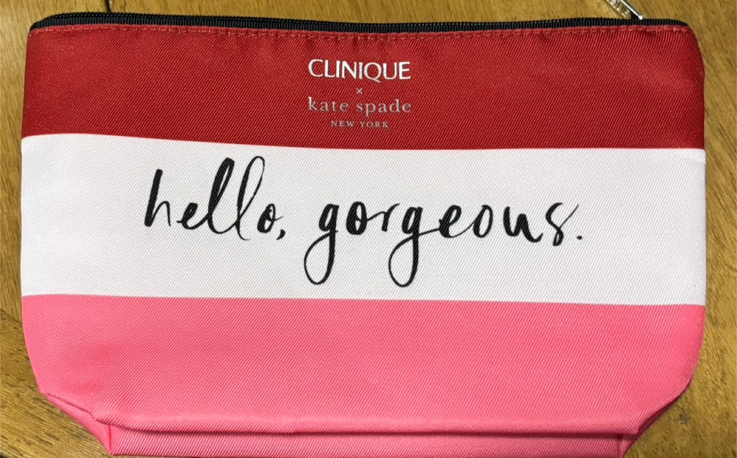 This Clinique x Kate Spade New York cosmetic bag features a "hello, gorgeous" design. It's made of durable fabric and has a zippered closure. Perfect for organizing makeup and toiletries.