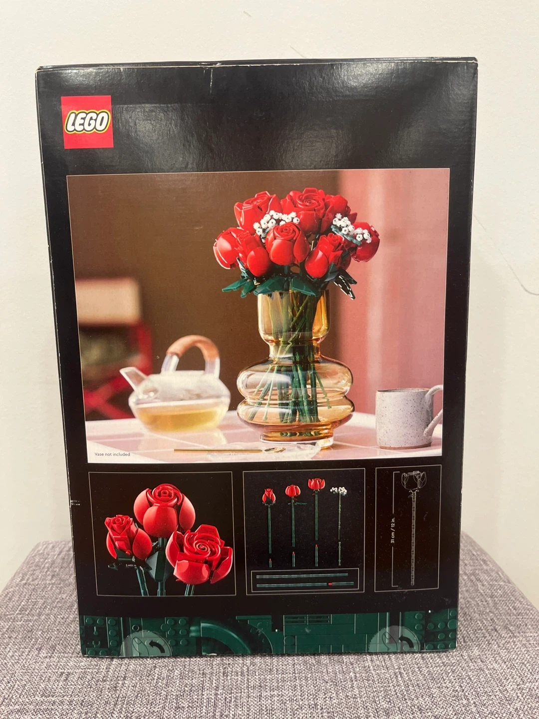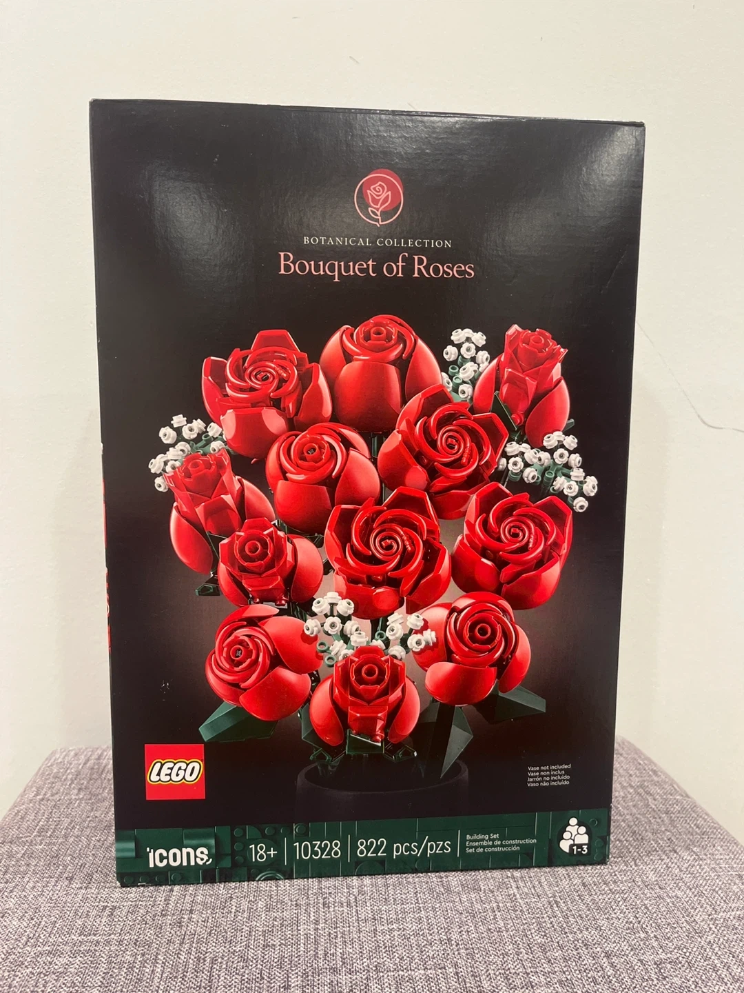 Build your own beautiful bouquet with the LEGO Botanical Collection Bouquet of Roses. This set features 12 brick-built roses with long green stems, perfect for display. It includes 822 pieces and is designed for ages 18+.