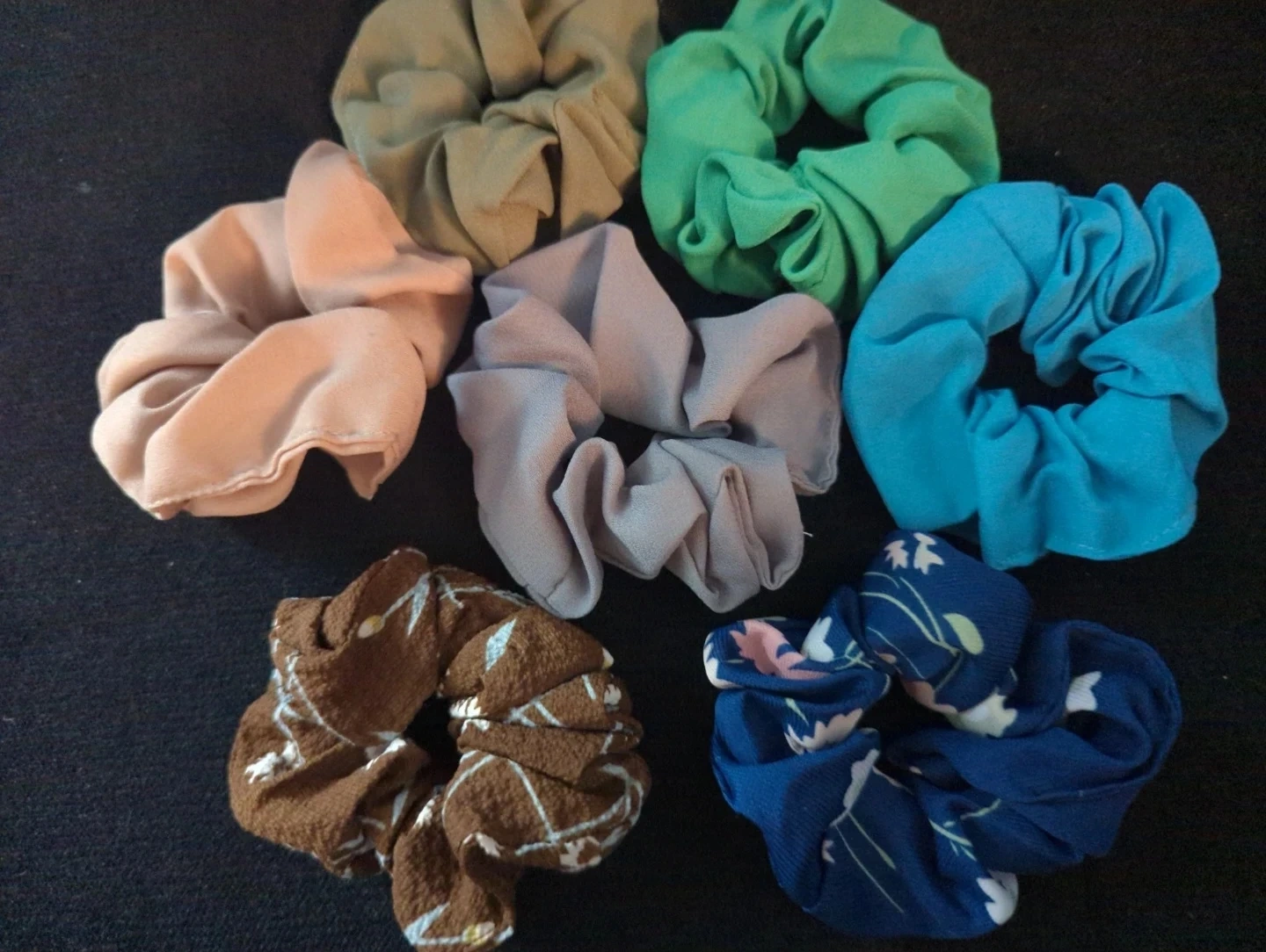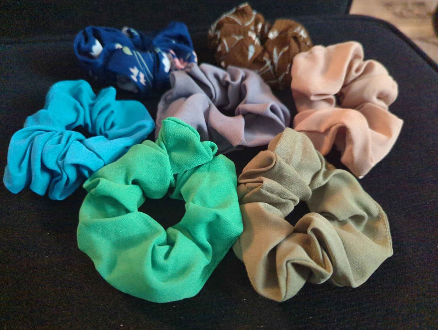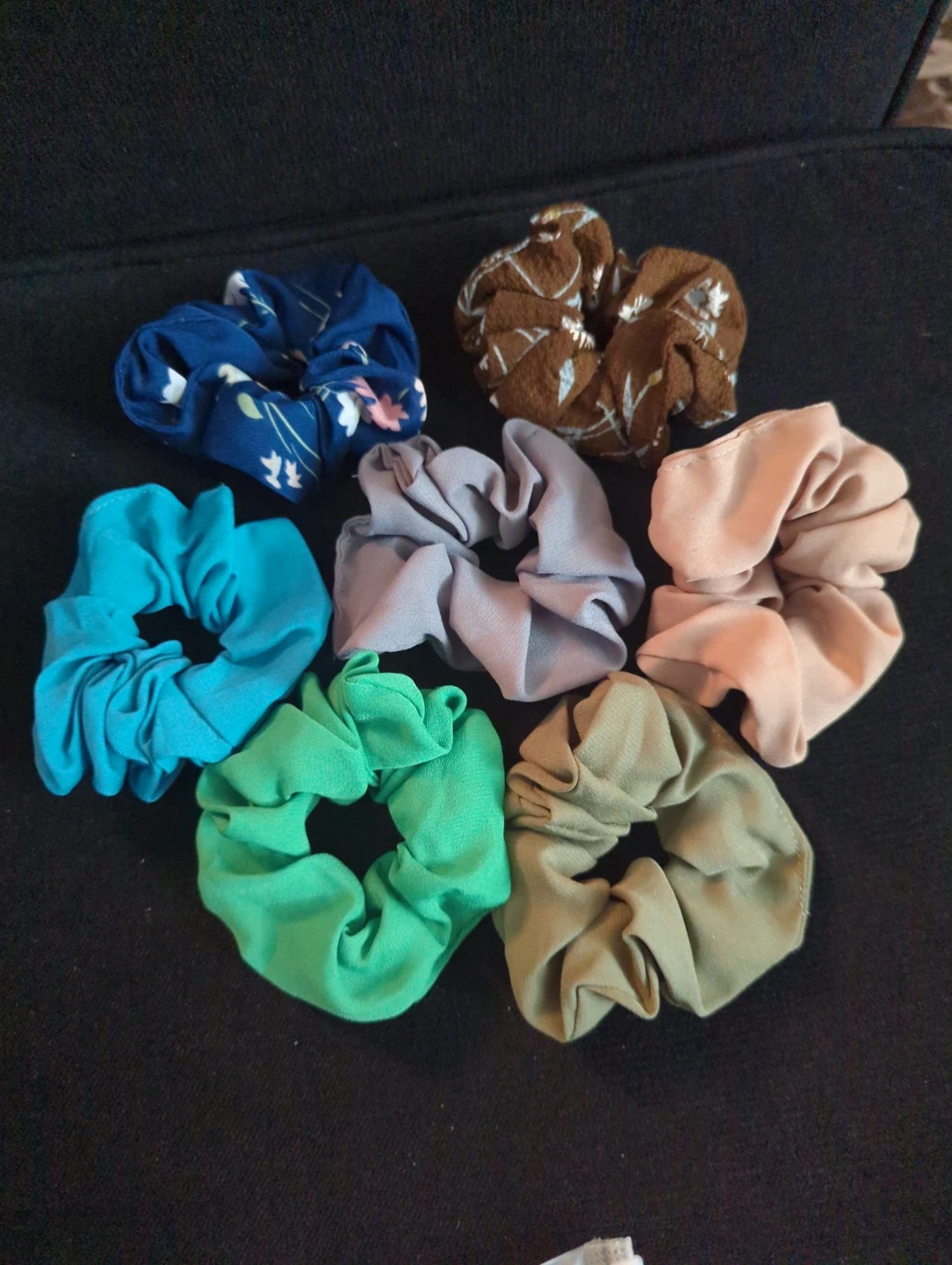 This is a set of seven scrunchies in various colours and patterns. Includes solid colours like blue, teal, green, beige, and grey, plus two patterned scrunchies. Fabric material. Never Used