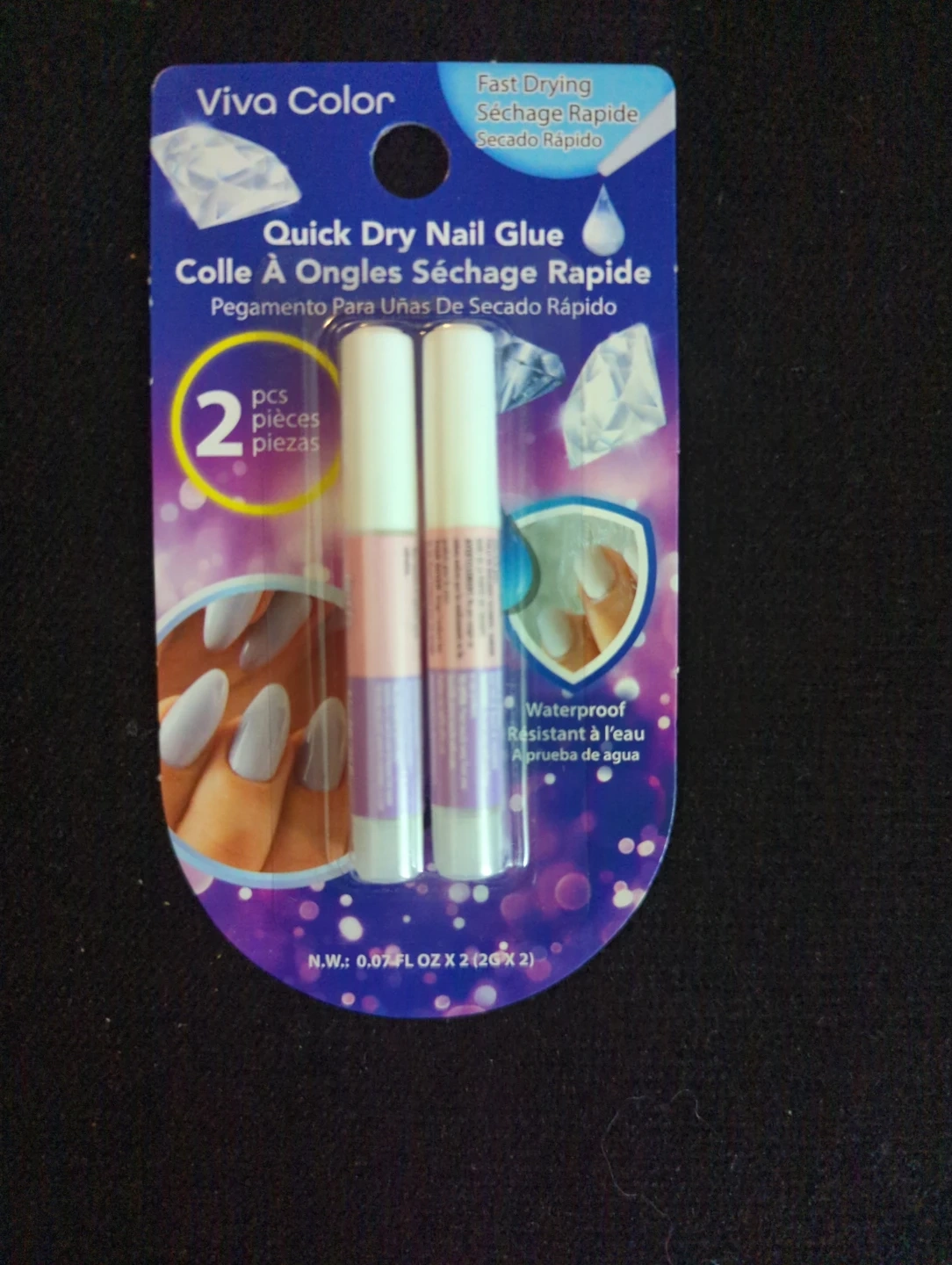 This is a two-pack of Viva Color Quick Dry Nail Glue. It's fast drying and waterproof. This nail glue is useful for applying artificial nails quickly and securely.