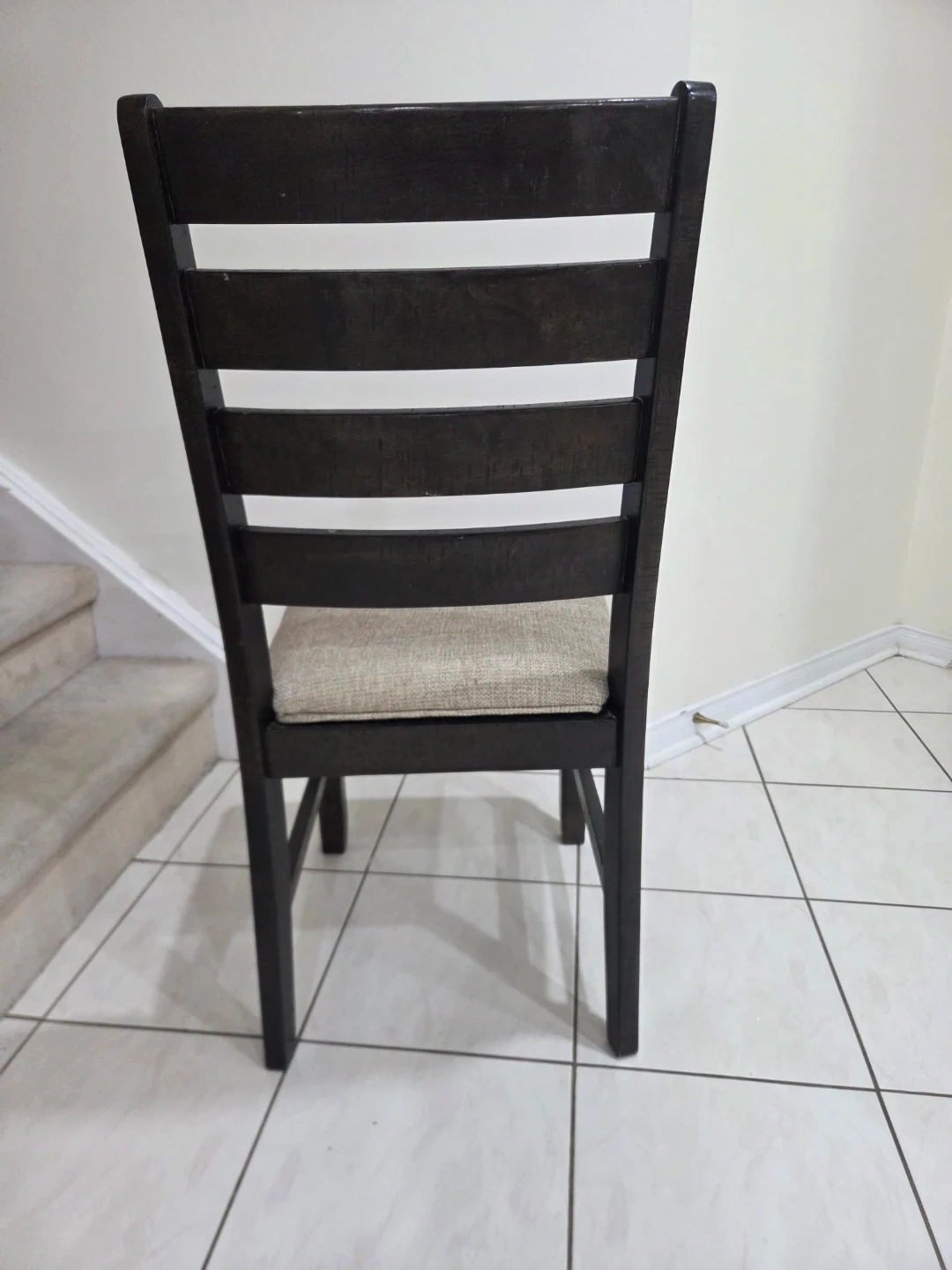Giving away 8 dining room chairs with a dark wood frame and a neutral-coloured seat. It's in good condition and would be a nice addition to any dining set!