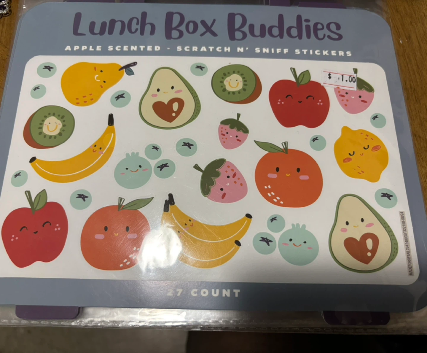 This pack includes 27 apple-scented, scratch 'n' sniff stickers. They feature fun fruit designs like apples, bananas, avocados, and strawberries. These stickers are great for decorating lunch boxes or crafts!