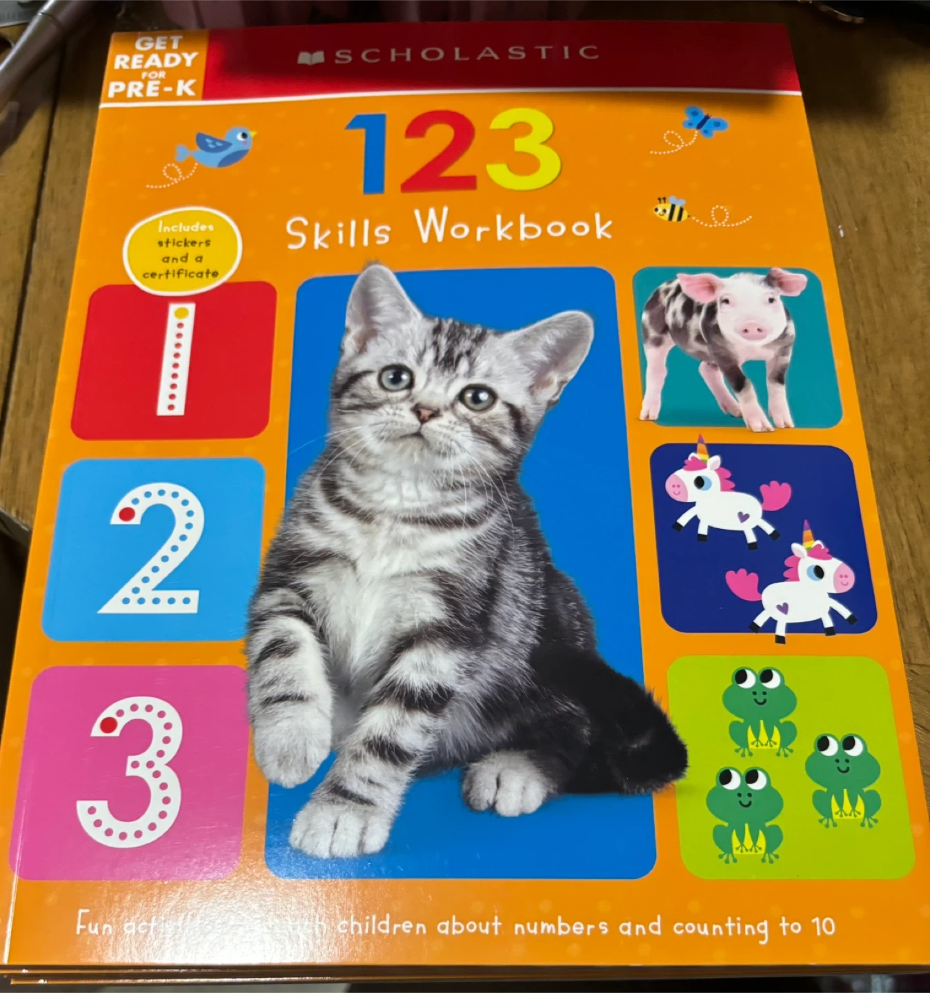 Get ready for Pre-K with this 123 Skills Workbook from Scholastic. It includes fun activities about numbers and counting to 10. This workbook also comes with stickers and a certificate!