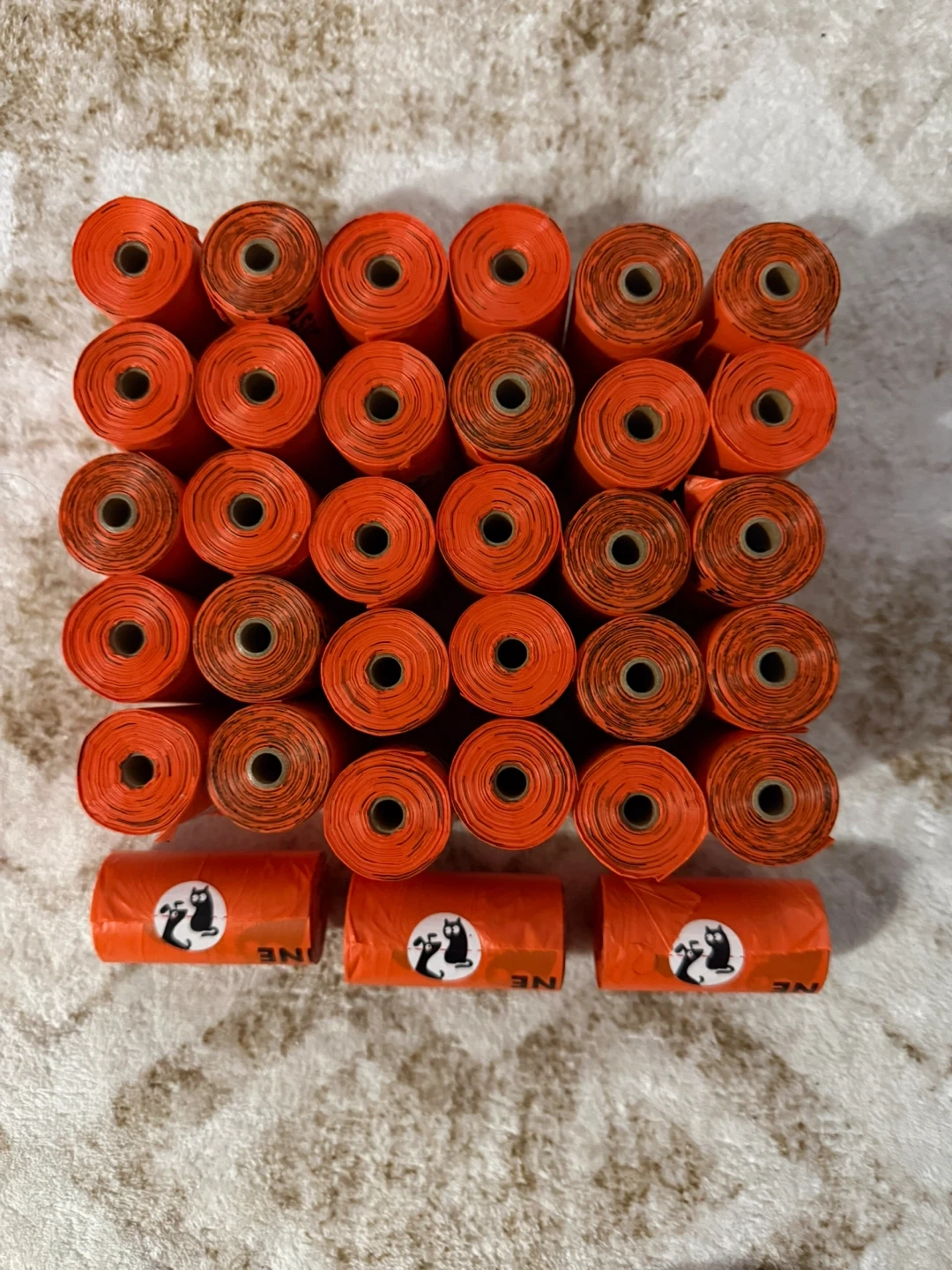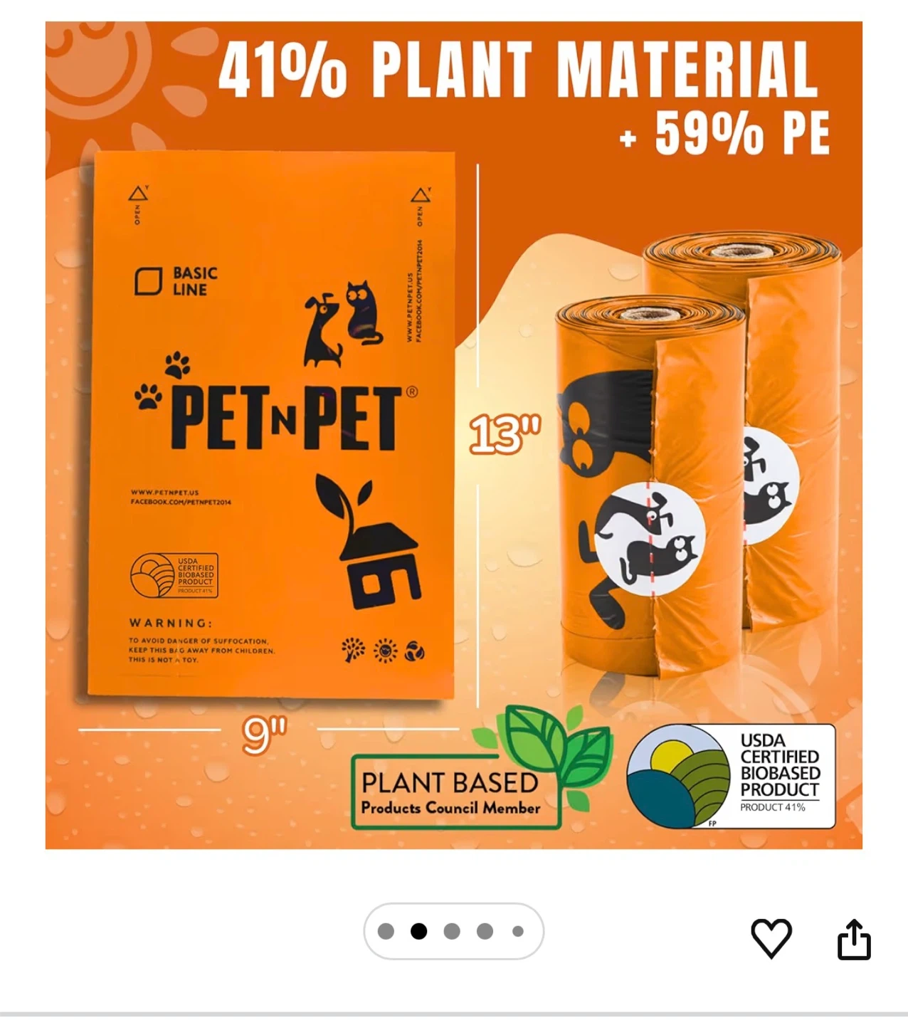 PET n PET dog waste bags come in a bright orange colour. These bags are made with 41% plant material and 59% PE. They're great for convenient clean-ups on walks!