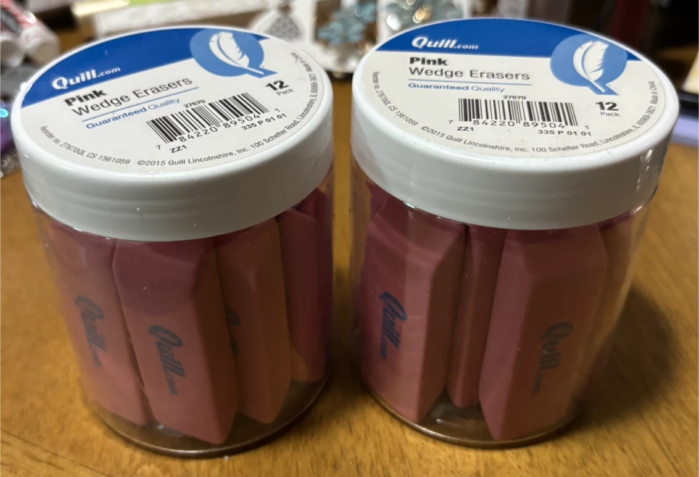 This listing includes two jars of pink wedge erasers from Quill.com. Each jar contains 12 erasers.