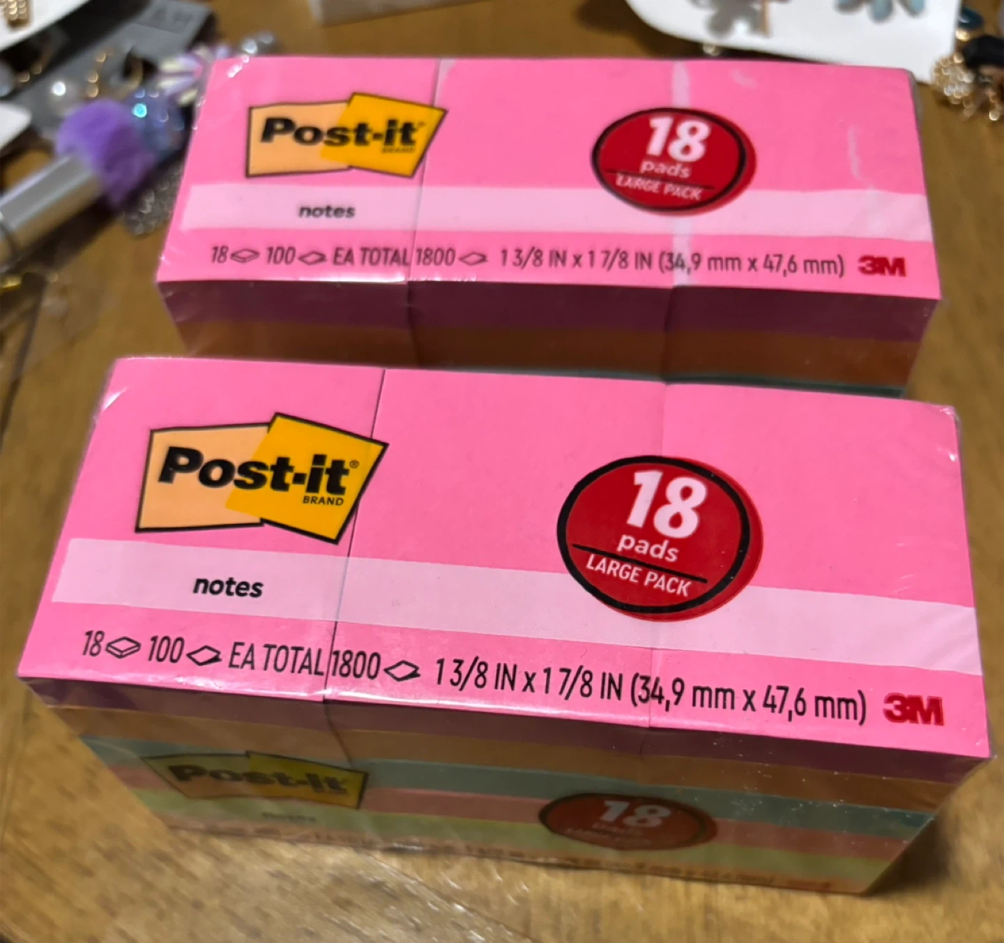 This listing is for two large packs of Post-it Notes. Each pack contains 18 pads of notes. The dimensions of each note are 1 3/8 inches by 1 7/8 inches (34.9 mm x 47.6 mm).