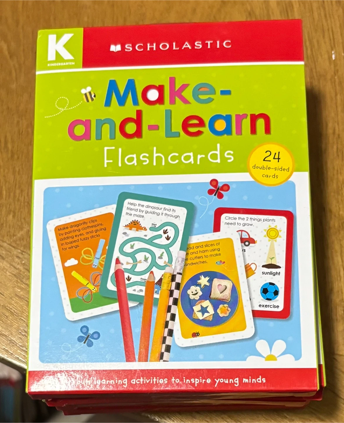 This set includes 24 double-sided flashcards for kindergarten learning activities. Activities cover making dragonfly clips, guiding a dinosaur through a maze, and making sandwiches with cookie cutters. It also includes a card about what plants need to grow, like sunlight and exercise.