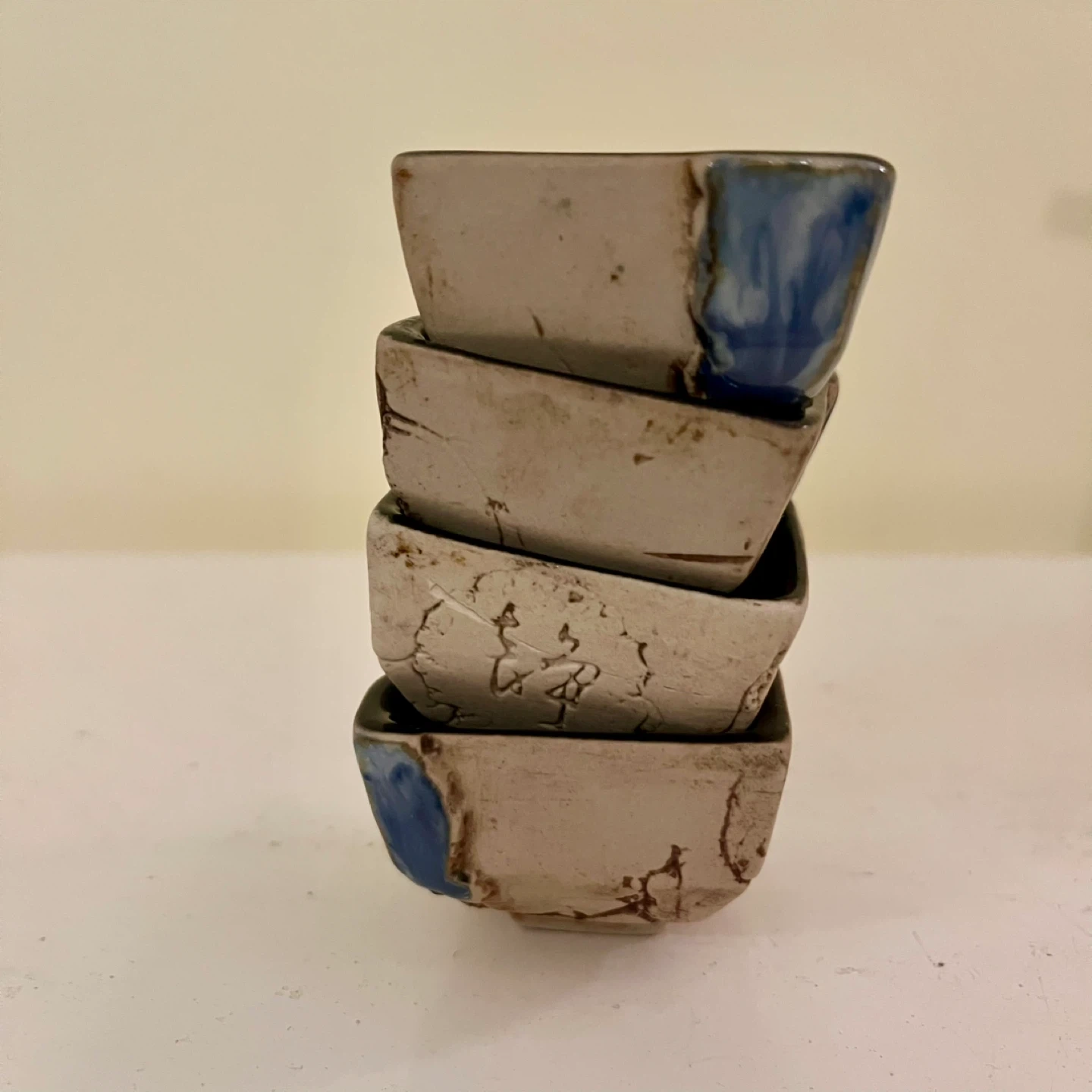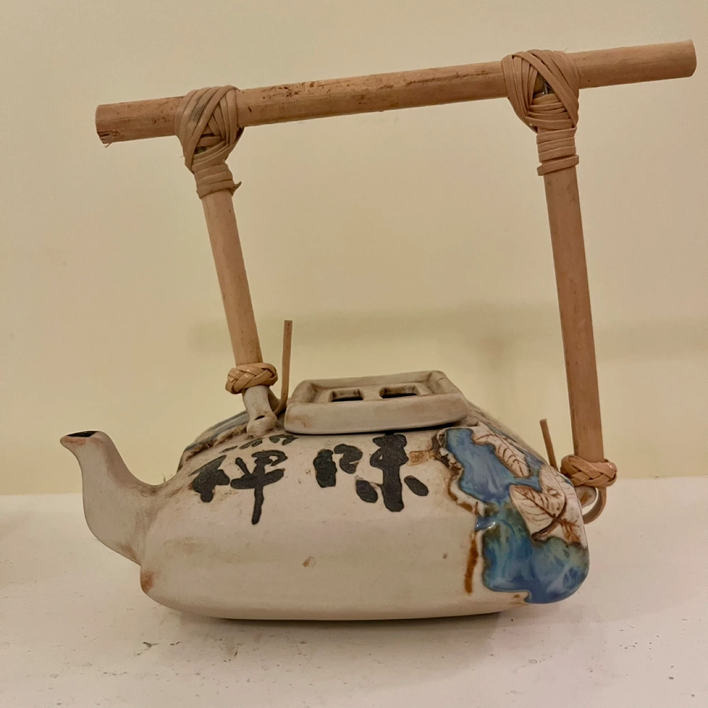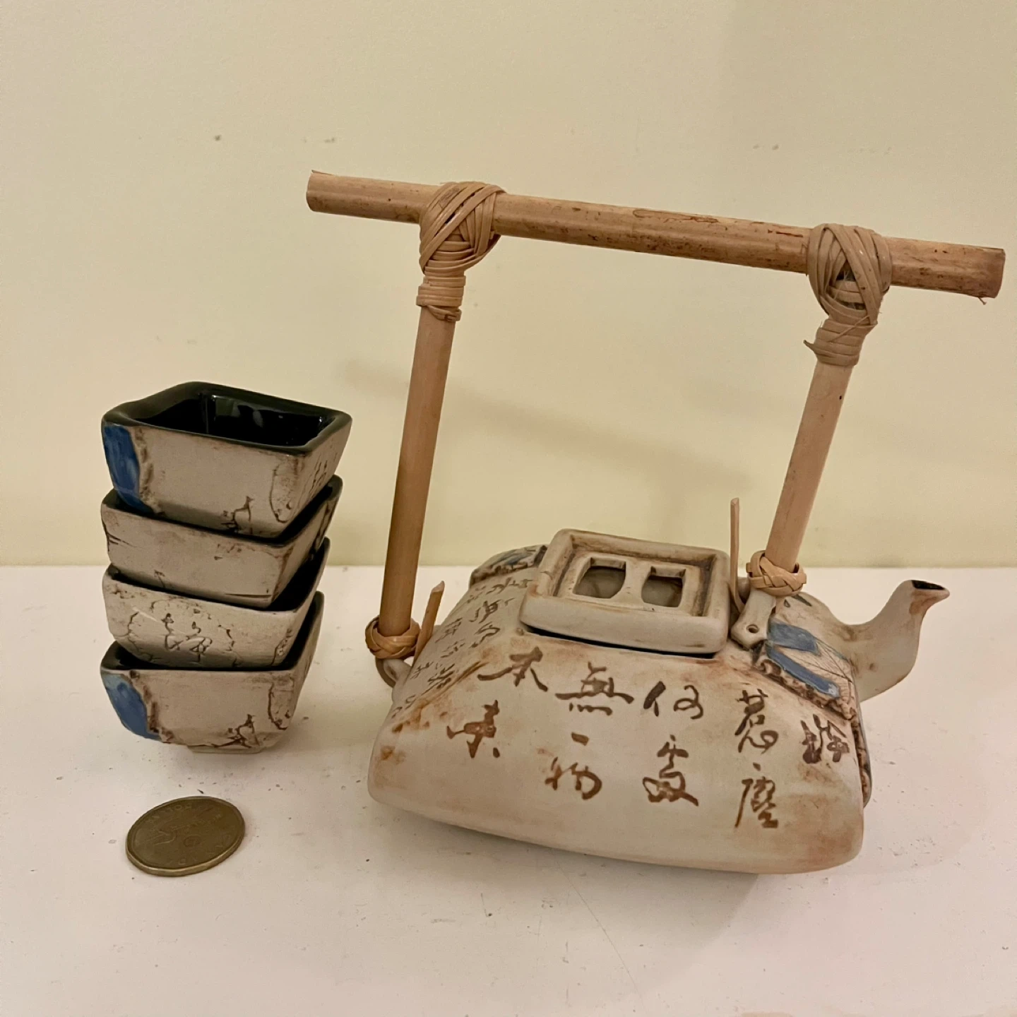 Vintage Malaysia Handicraft Tenmoku tea pot with bamboo handle and four teacups. This charming set of pottery is in very good vintage condition. Loonie shown for scale.