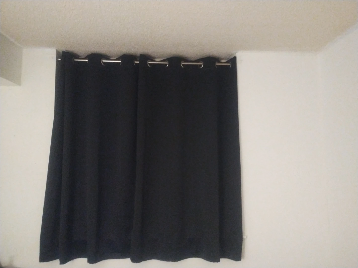 Two black blackout curtains with grommet tops. Material appears to be polyester. They're good for blocking light and adding privacy. Ready to hang!