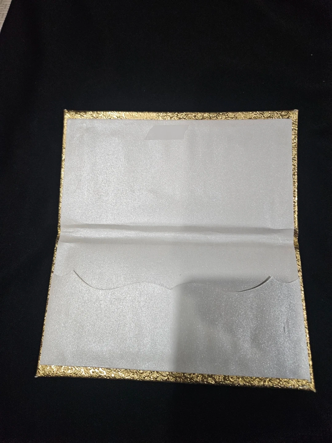 This decorative box is designed to hold gift cards or small notes. It features a textured gold exterior and a satin-lined interior. The ornate gold laser-cut overlay on the lid adds an elegant touch.
