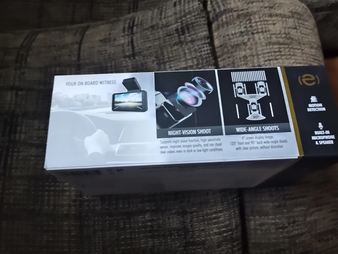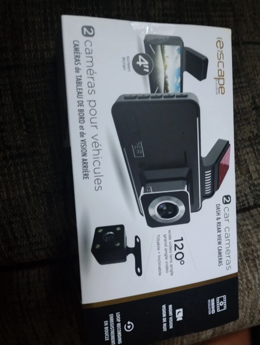 This e-scape dash and rear view camera set comes with a 4-inch display screen. It features 120° wide-angle front and 90° wide-angle rear cameras for comprehensive recording. Supports night vision and has a built-in microphone and speaker. Includes 2 cameras (front & rear), car charger, wiring and bilingual instruction manual.
