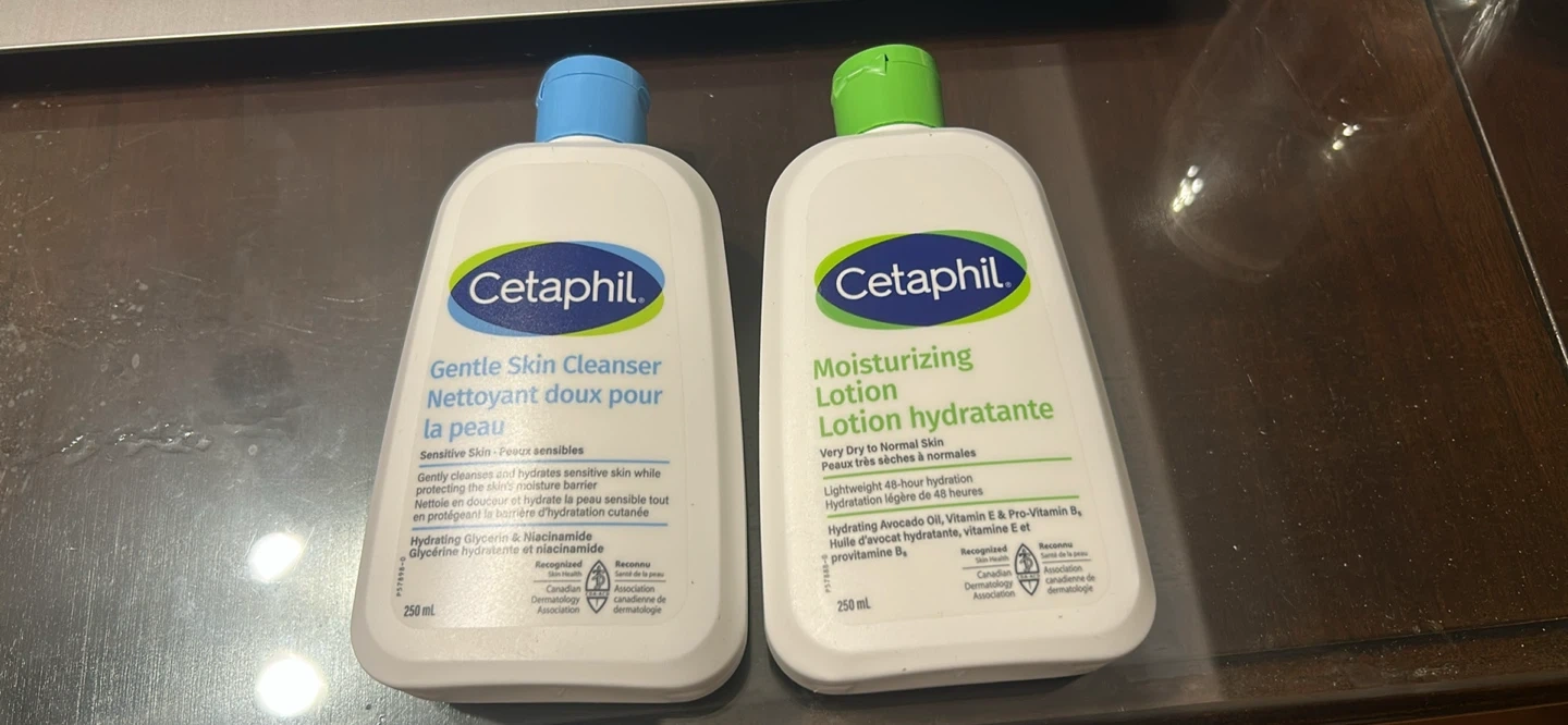 Cetaphil Gentle Skin Cleanser and a Cetaphil Moisturizing Lotion, both in 250ml bottles. Both are recognized by the Canadian Dermatology Association.
