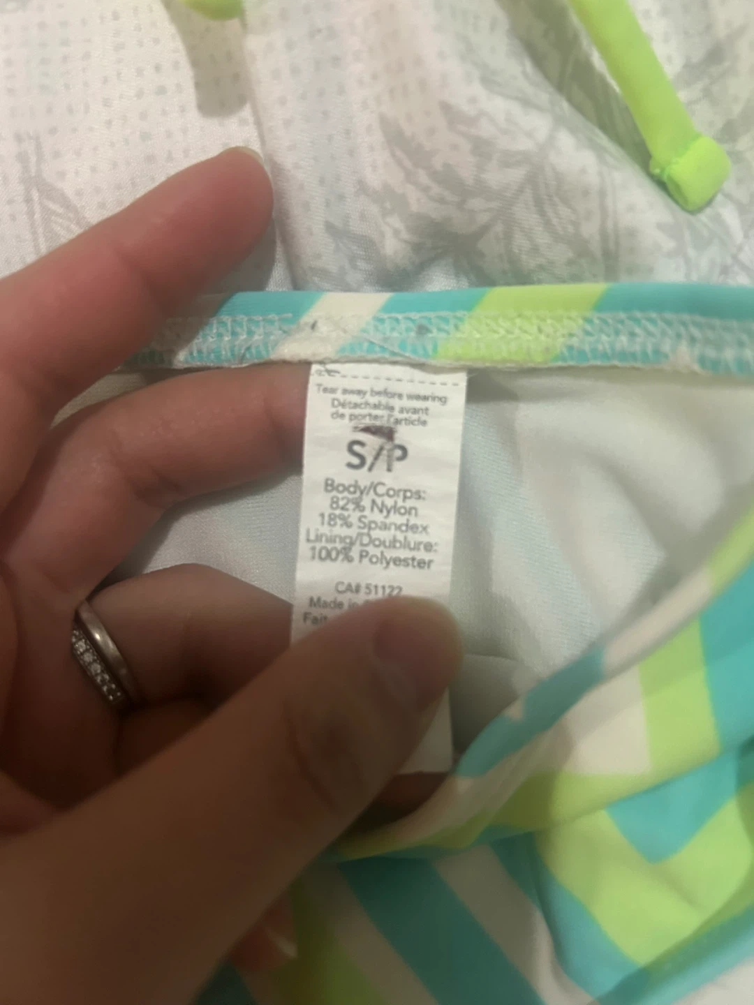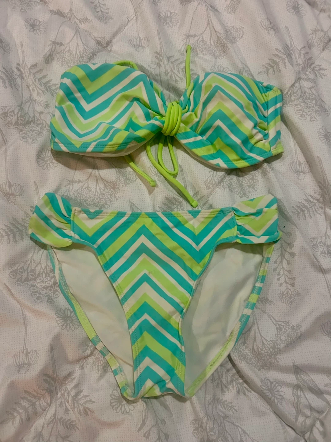 New two-piece bikini with a colourful chevron pattern. Made with 82% Nylon and 18% Spandex. Includes a polyester lining. Sizes S/P and L/G available.