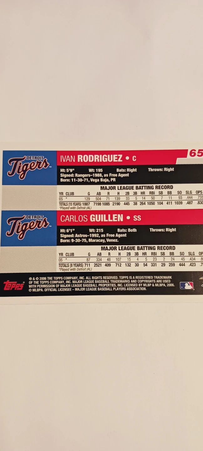 Card features Ivan Rodriguez and Carlos Guillen. Includes their Major League Baseball batting records. Back of card is dated 2006. Mint condition. ALL MY PRICES ARE NEGOTIABLE !!