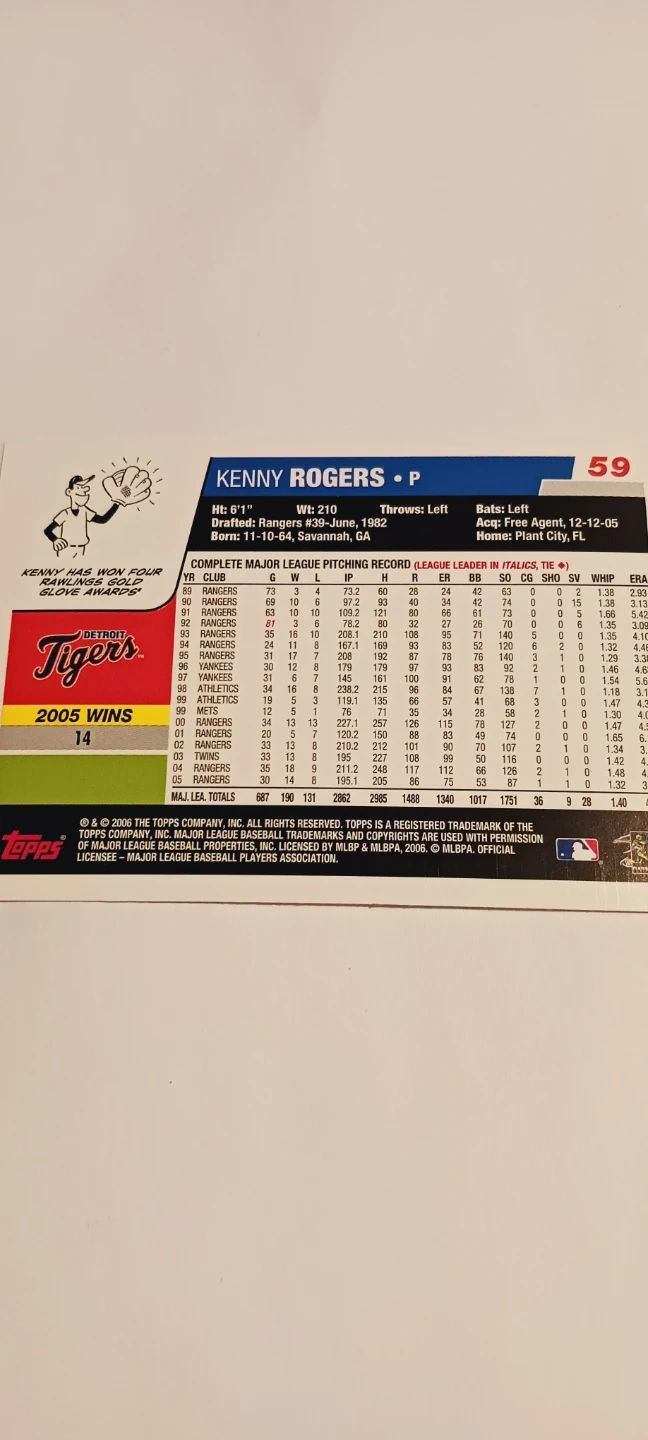 Topps 2006. baseball card featuring Kenny Rogers. The card details his pitching career statistics and personal information. It's a great collectible for baseball fans! Mint condition. ALL MY PRICES ARE NEGOTIABLE !!