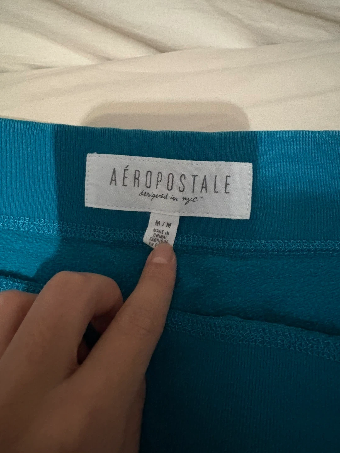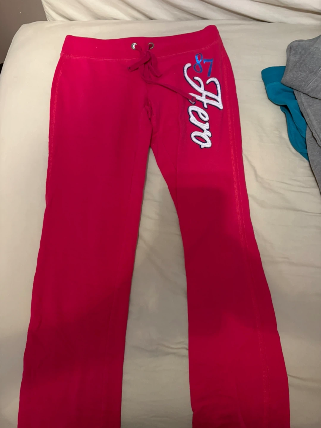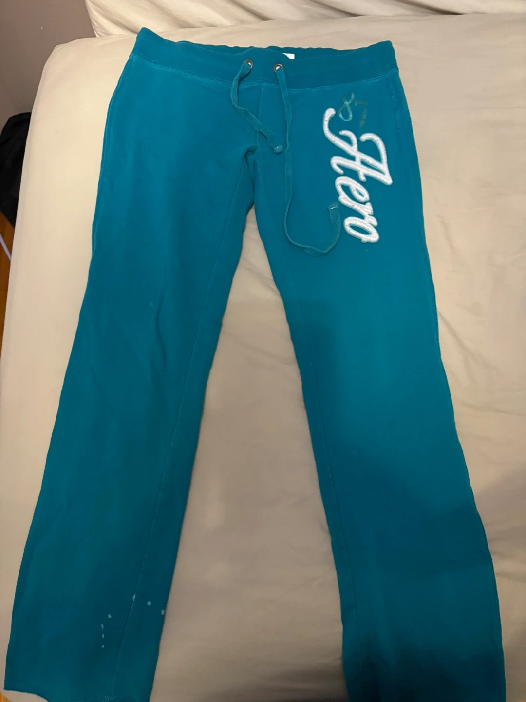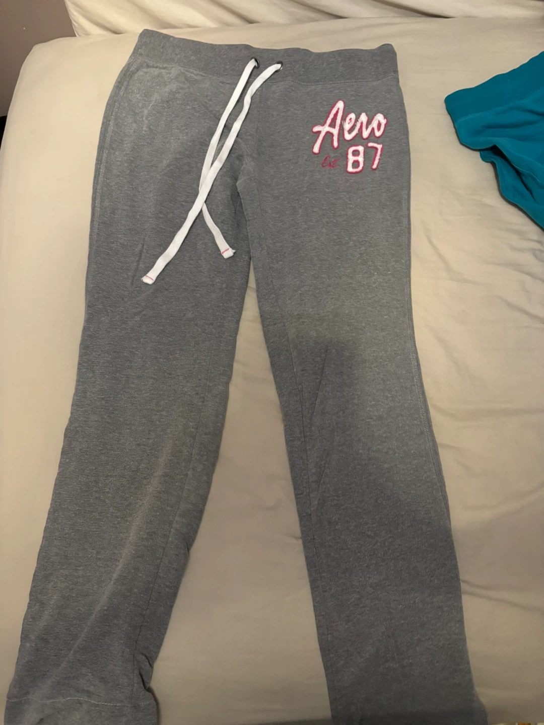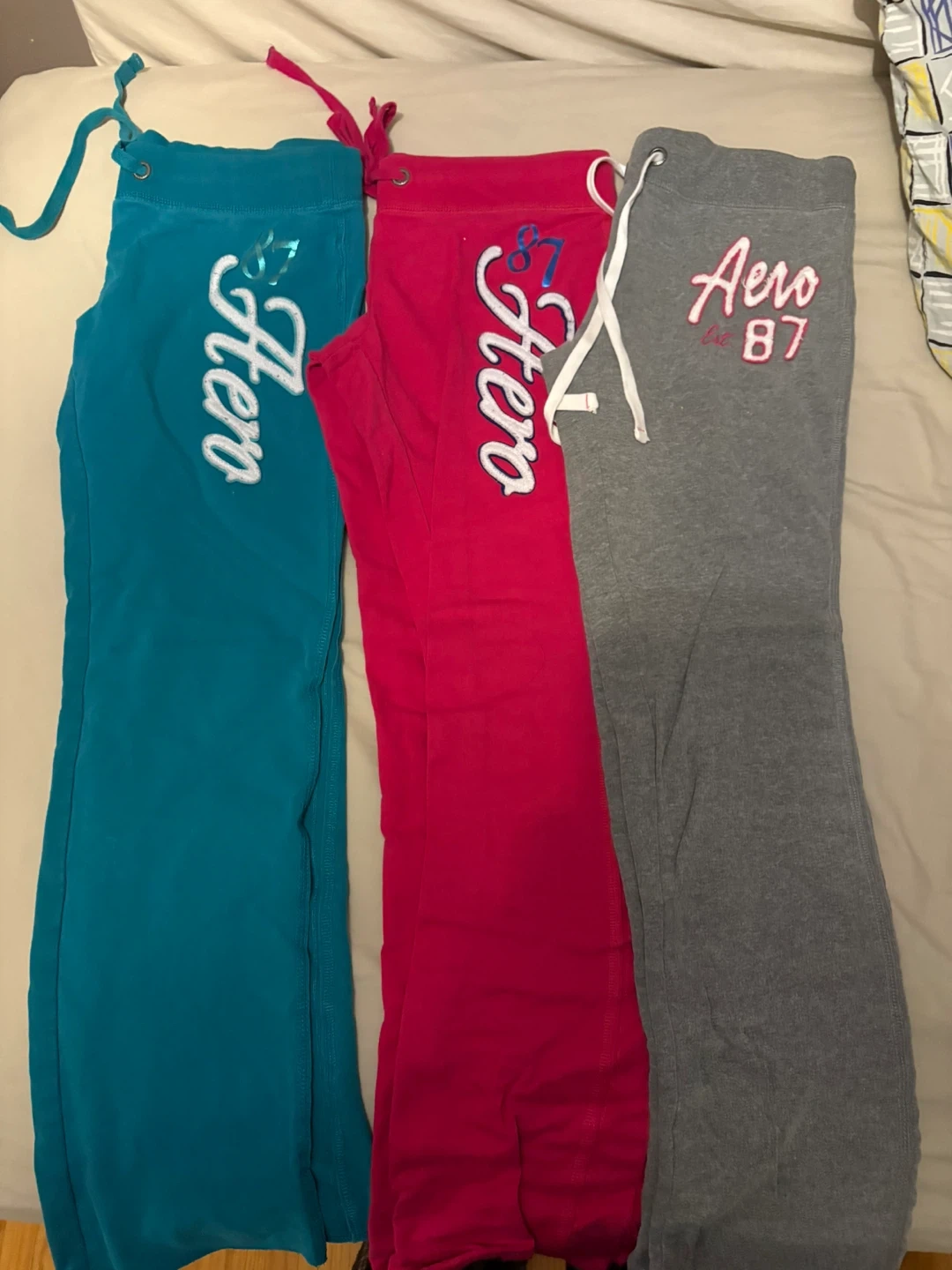 15$ each. Price is negotiable. Three pairs of Aeropostale sweatpants in sizes medium. Includes one teal pair with white lettering, one fuchsia pair with white lettering, and one grey pair with pink "Aero 87" graphic. They're made from a comfortable blend. Vintage look.