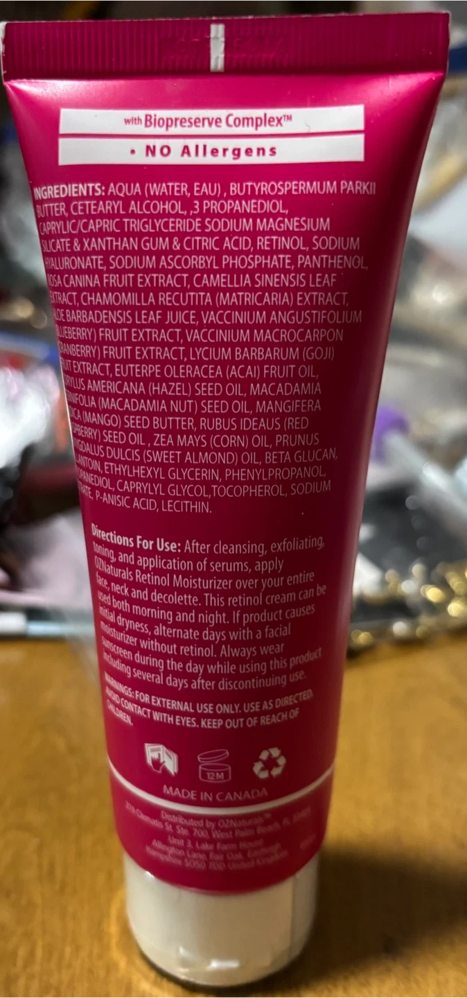 This OZ Naturals Super Youth Retinol Moisturizer is 98.6% natural. It contains Vitamin C, Vitamin B5, Shea Butter, and Hyaluronic Acid. The bottle is 118 mL or 4 FL. OZ. LIQ. US.