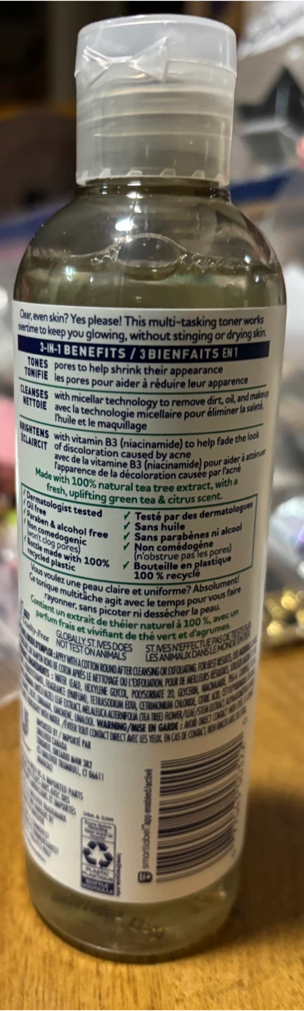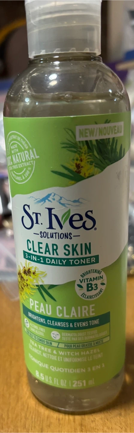 St. Ives Clear Skin 3-in-1 Daily Toner brightens, cleanses, and evens tone. Contains tea tree extract and witch hazel for a refreshing feel.