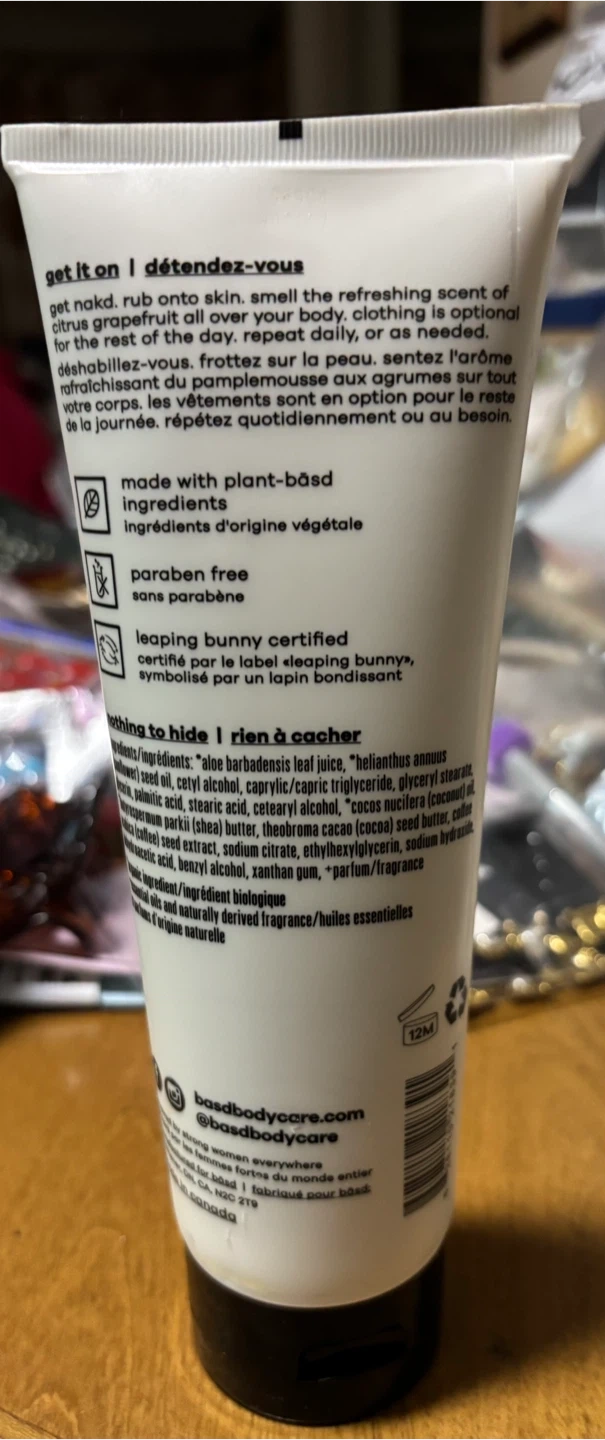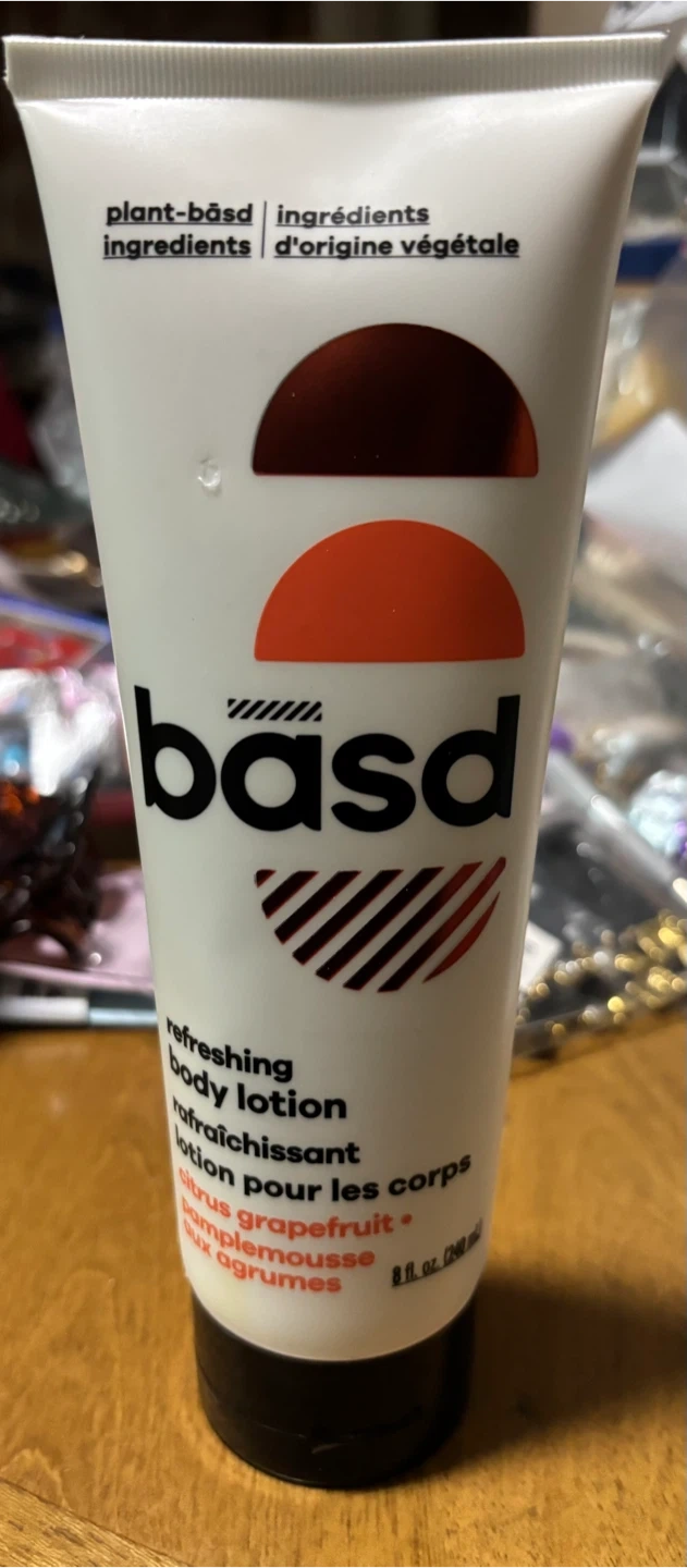 Basd refreshing body lotion with plant-based ingredients. It's a citrus grapefruit scent. Made with plant-based ingredients and paraben-free. 8 fl. oz. (240ml) bottle.