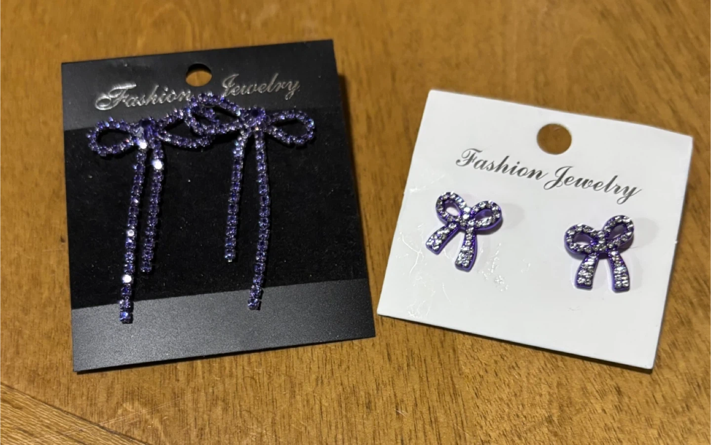 Set of two pairs of purple bow earrings, one pair is a dangling drop style and the other is a stud. Both are adorned with sparkly stones. Costume jewelry.