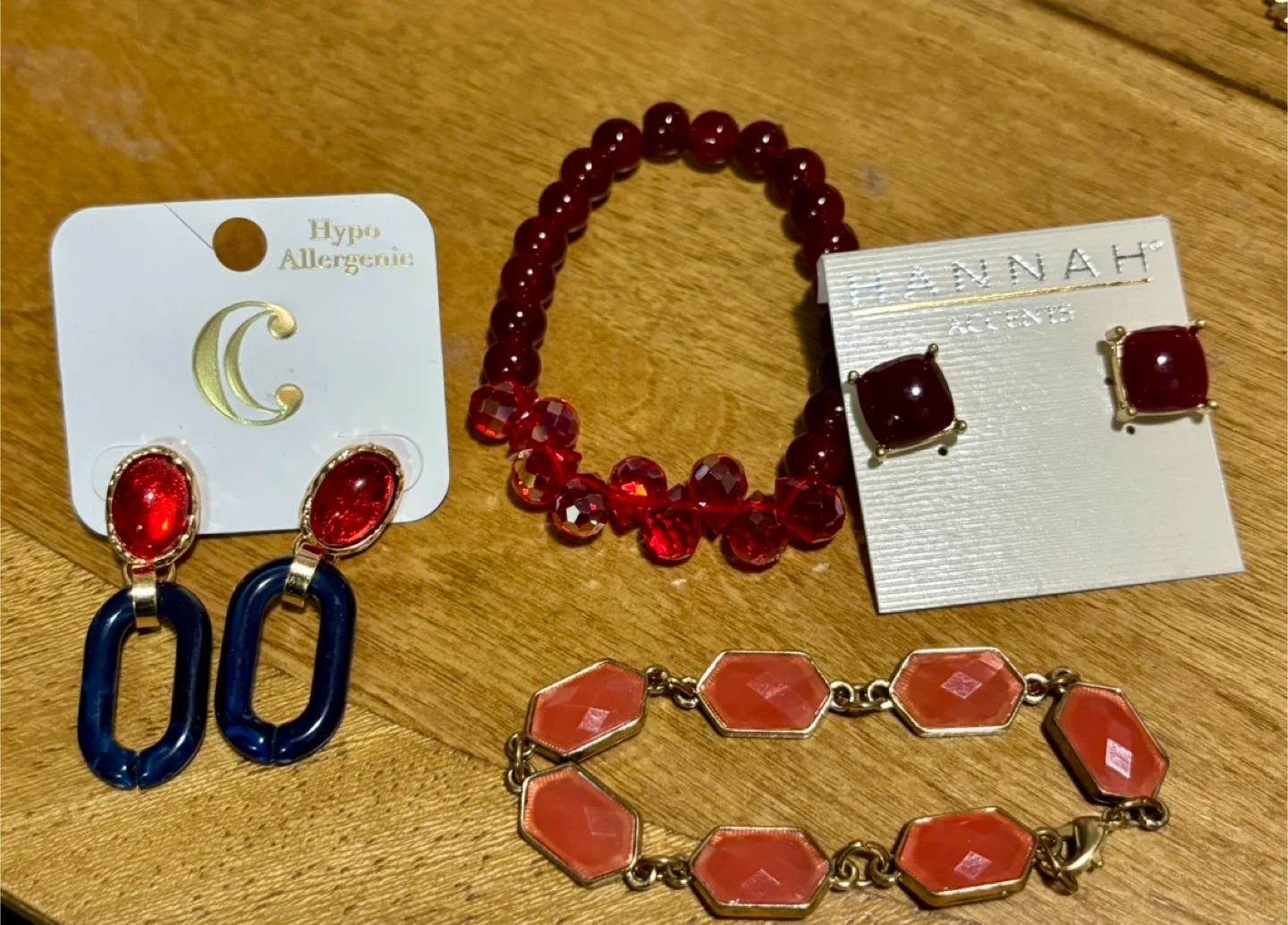 This set includes Hannah Accents square stud earrings with dark red stones and a matching dark red beaded bracelet. It also features a pair of drop earrings with red oval stones and navy blue links. An additional coral-colored hexagonal gemstone bracelet is included. These pieces offer a vibrant pop of color!