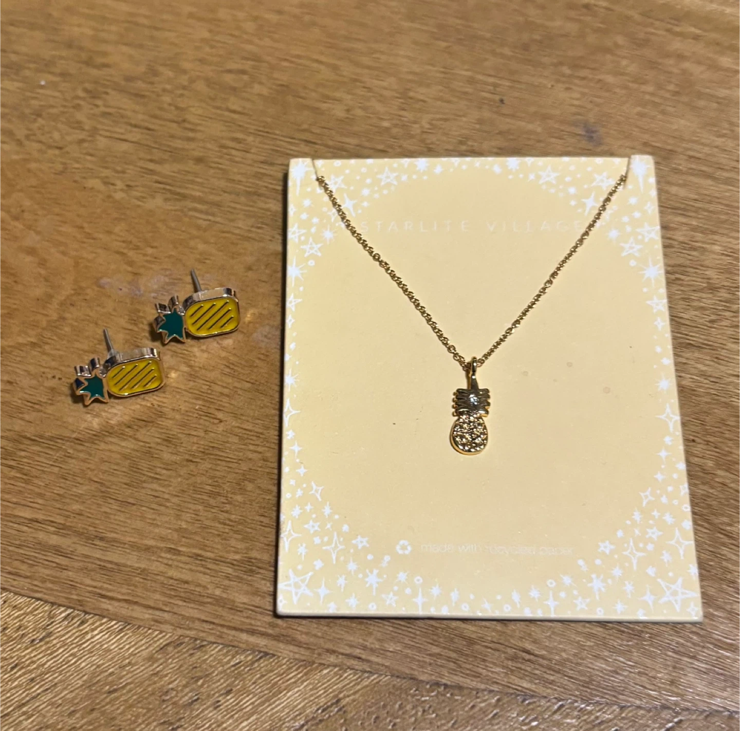 This set includes a necklace with a pineapple charm and pineapple earrings. The necklace charm is gold-tone with clear rhinestones. The earrings are yellow with green stars.