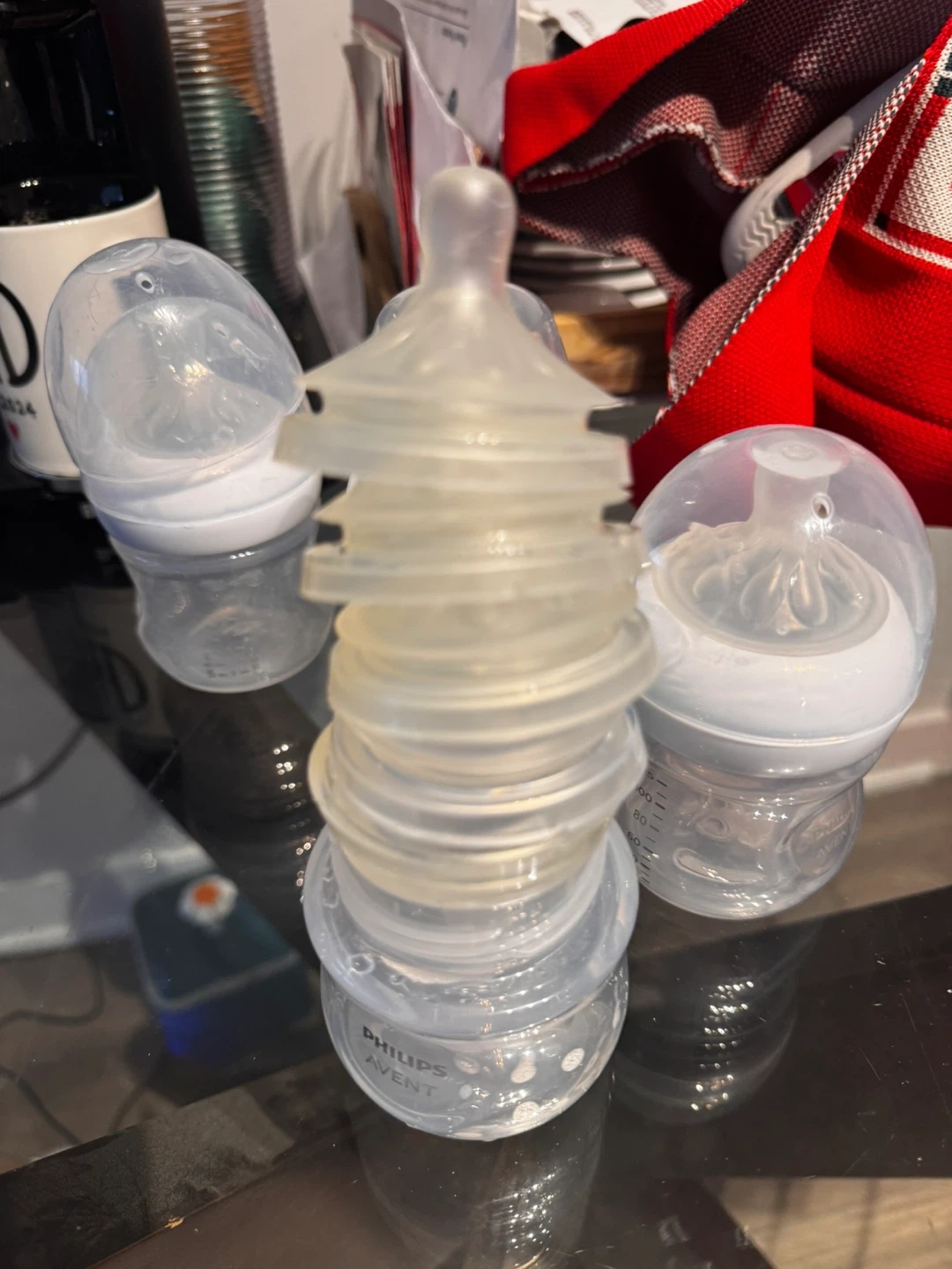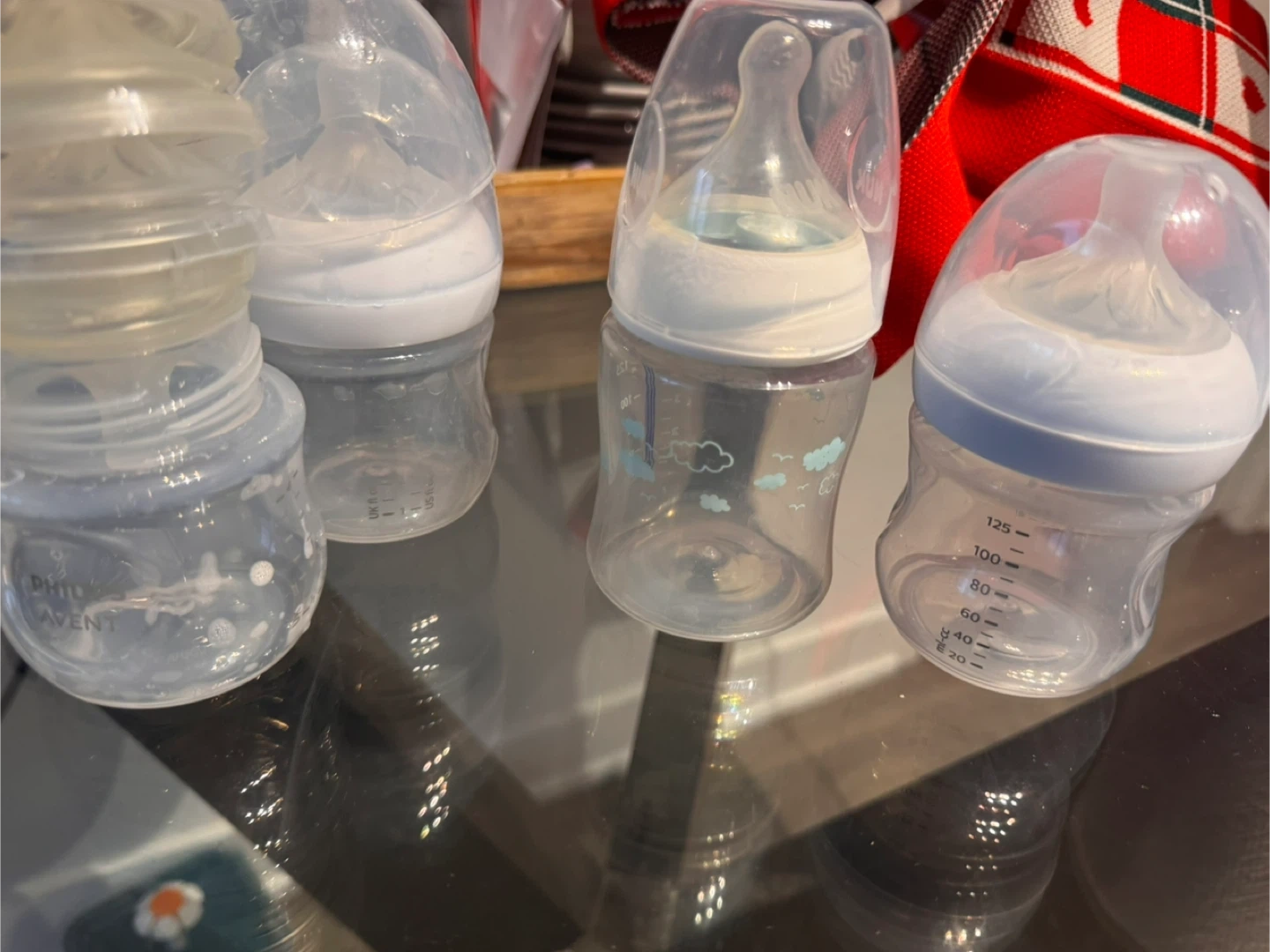 A bundle of Philips Avent baby bottles and nipples. Various sizes included, with clear measurement markings on the bottles. It's good for feeding your little one.