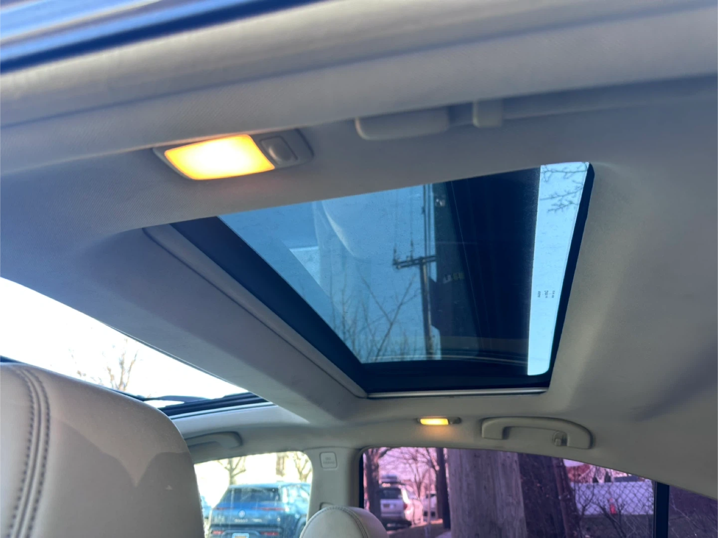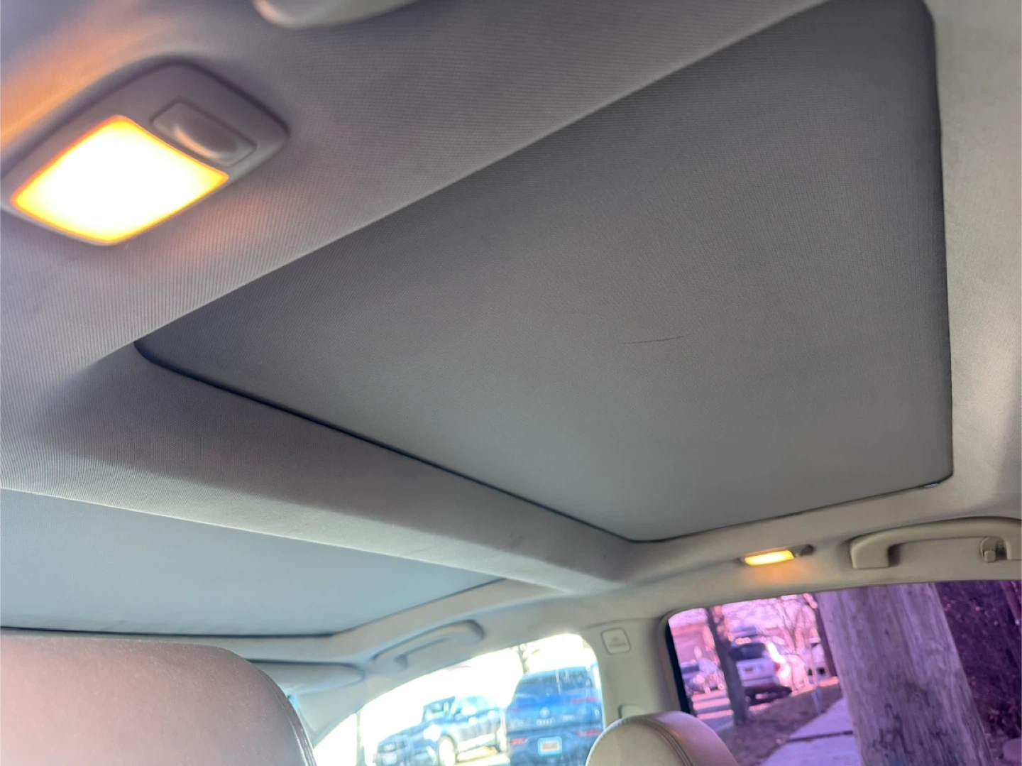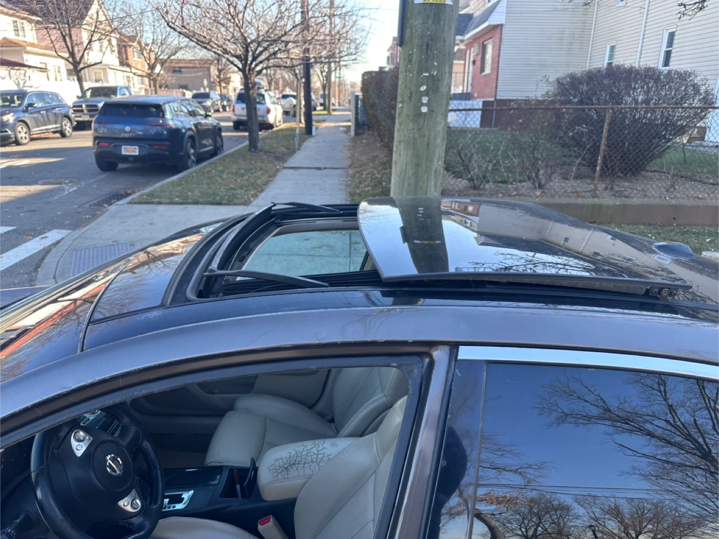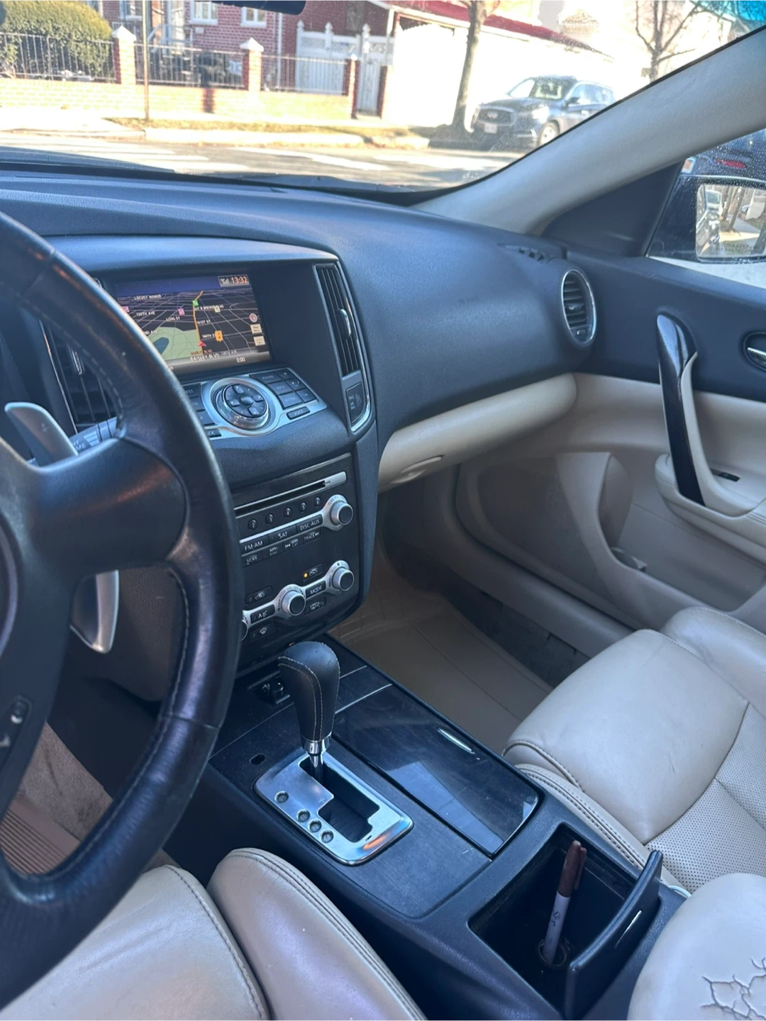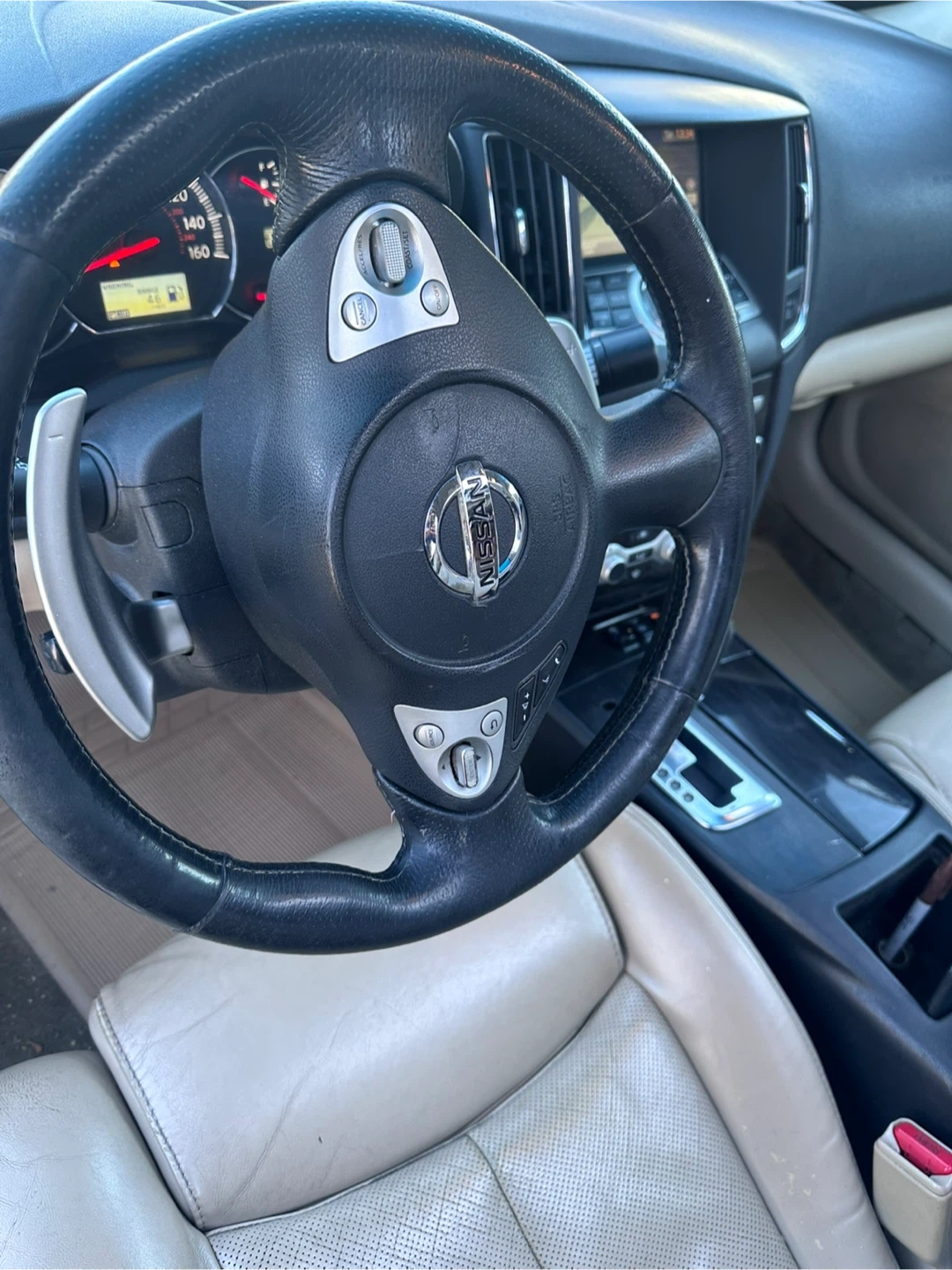 This is a Nissan Maxima sedan in a gray color. It features a sunroof and leather interior. The car's odometer shows mileage. This vehicle is good for daily commutes and family trips.