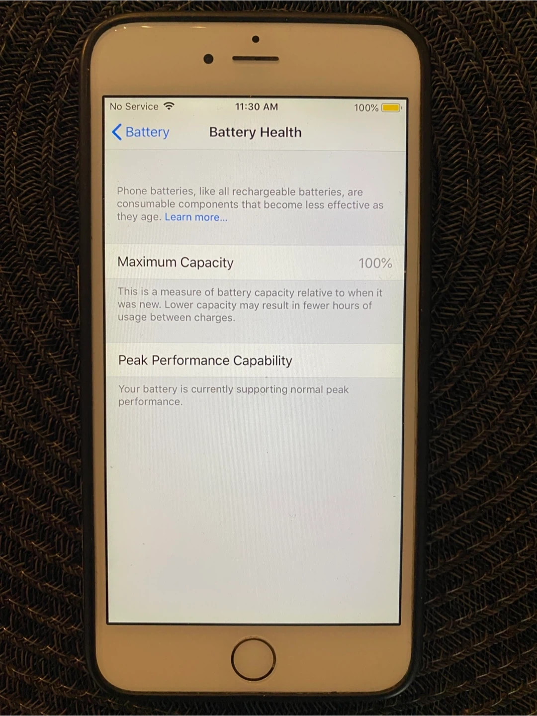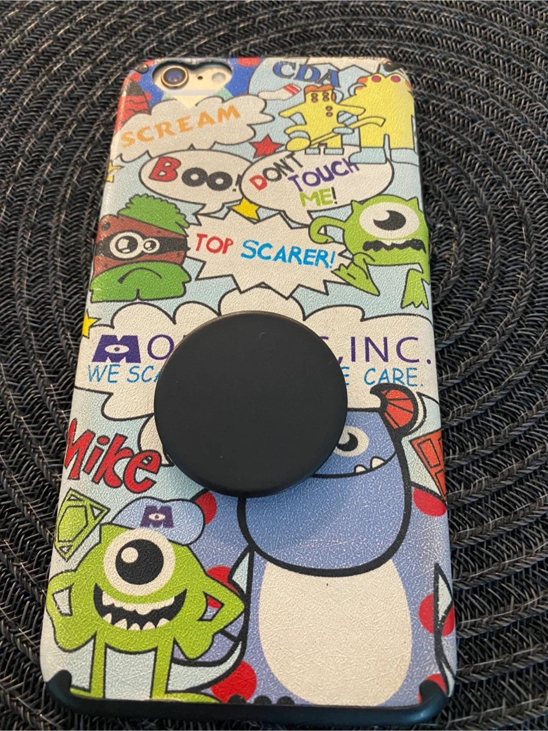 This is an Apple iPhone 6 Plus with 64GB of storage in gold. It's in used condition and includes a colourful Monsters Inc. themed phone case with a pop socket attached. The battery health is currently at 100%!