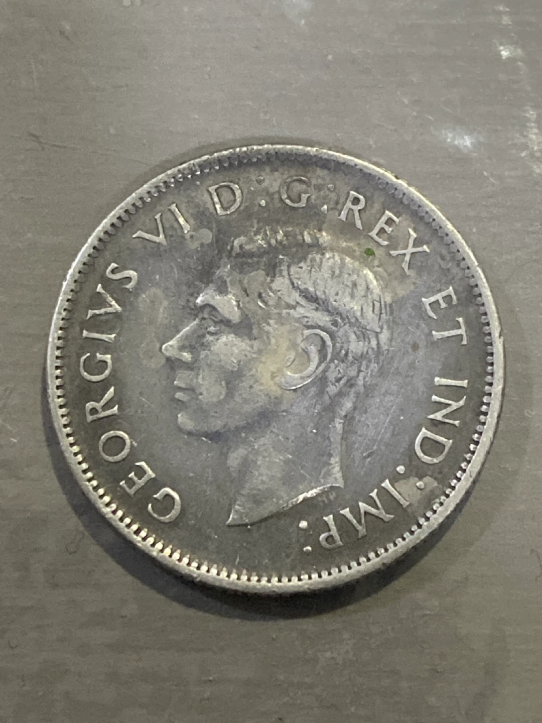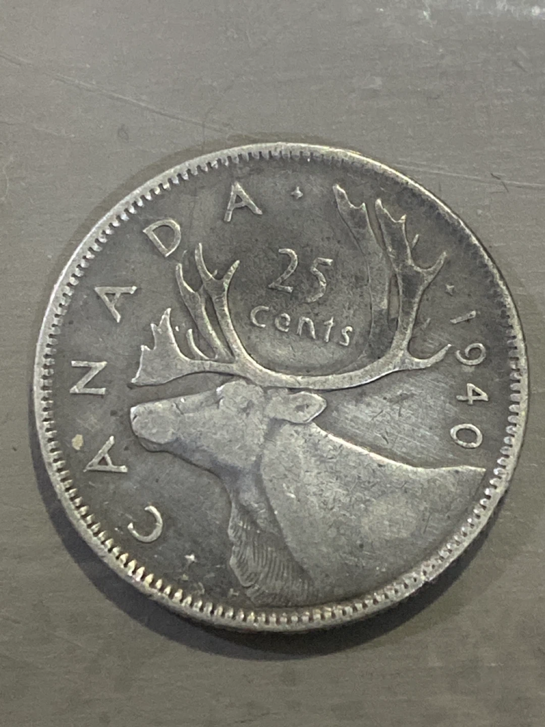 This is a 1940 Canadian 25 cents coin featuring King George VI. It's a silver coin with a moose on one side and the King's effigy on the other. A neat piece for collectors!