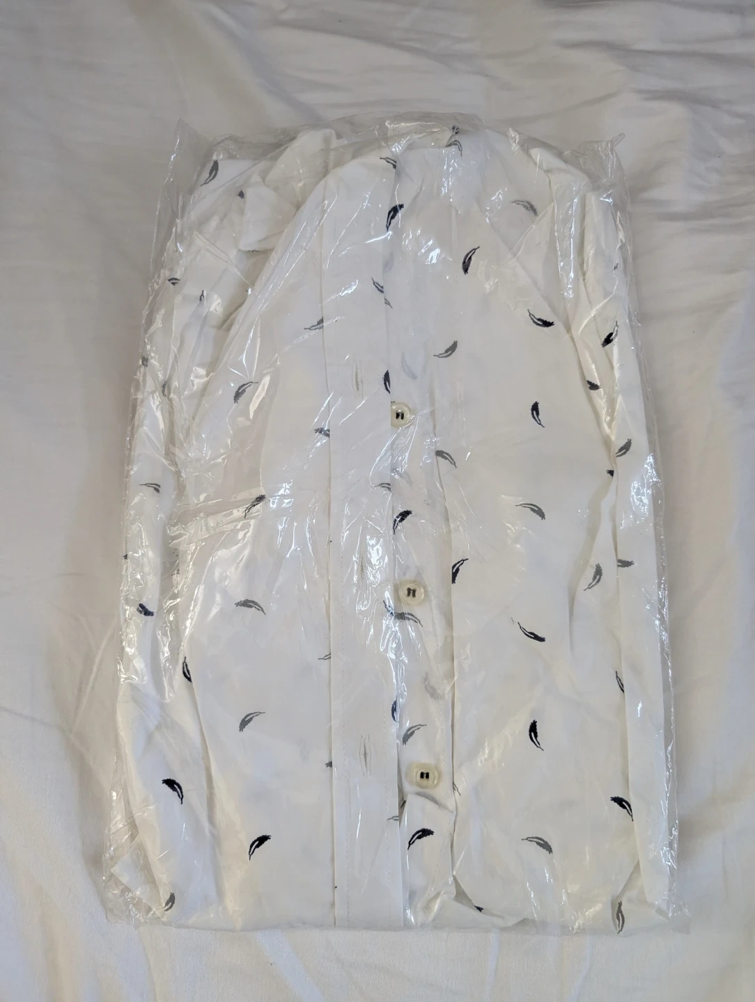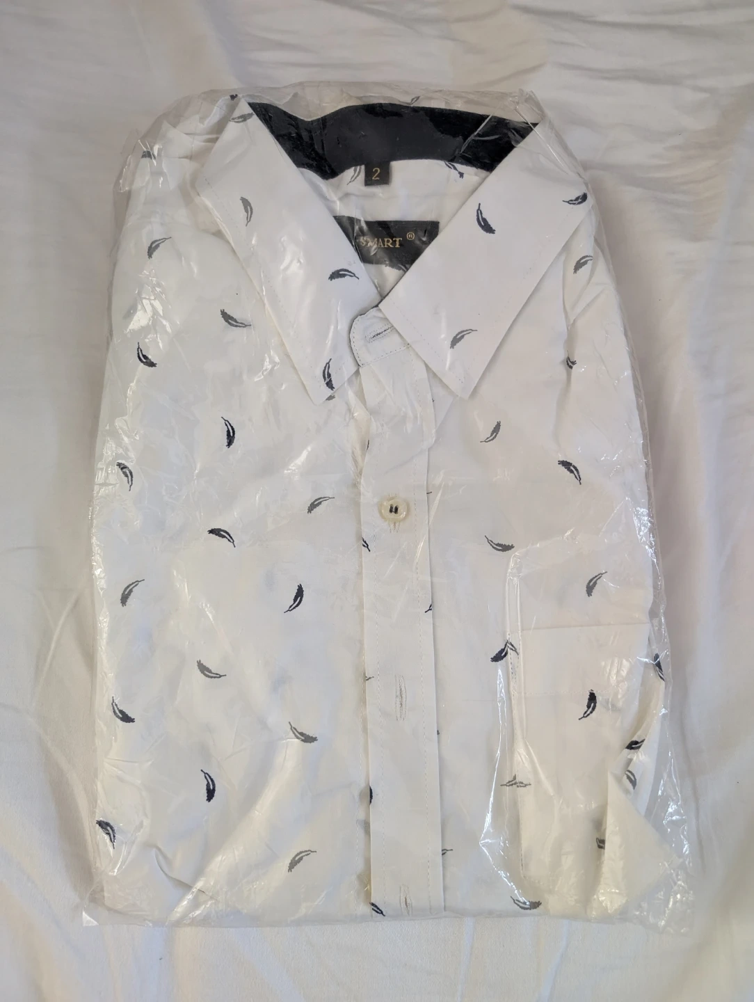 SMART men's button-up shirt. White with a subtle dark feather print. Long sleeves and a classic collar.