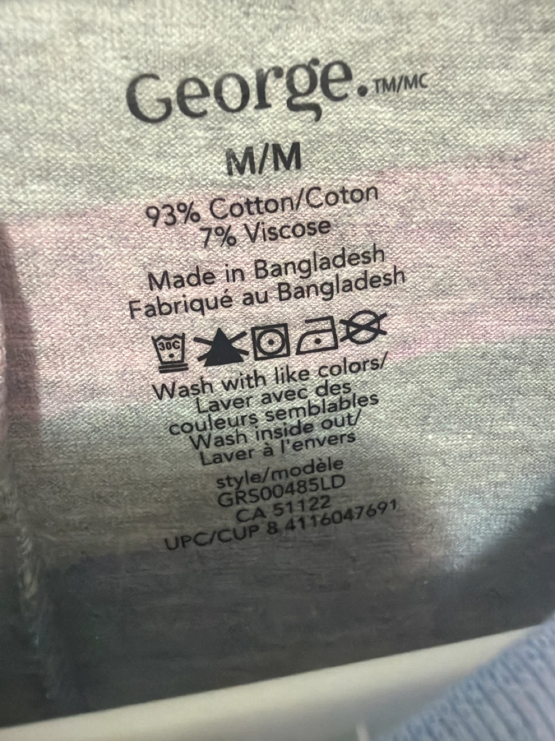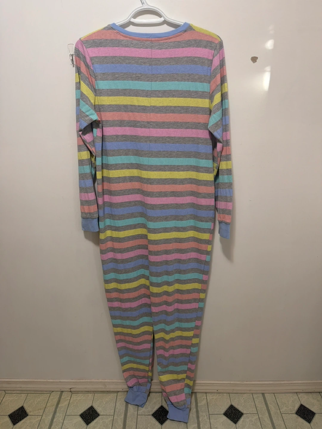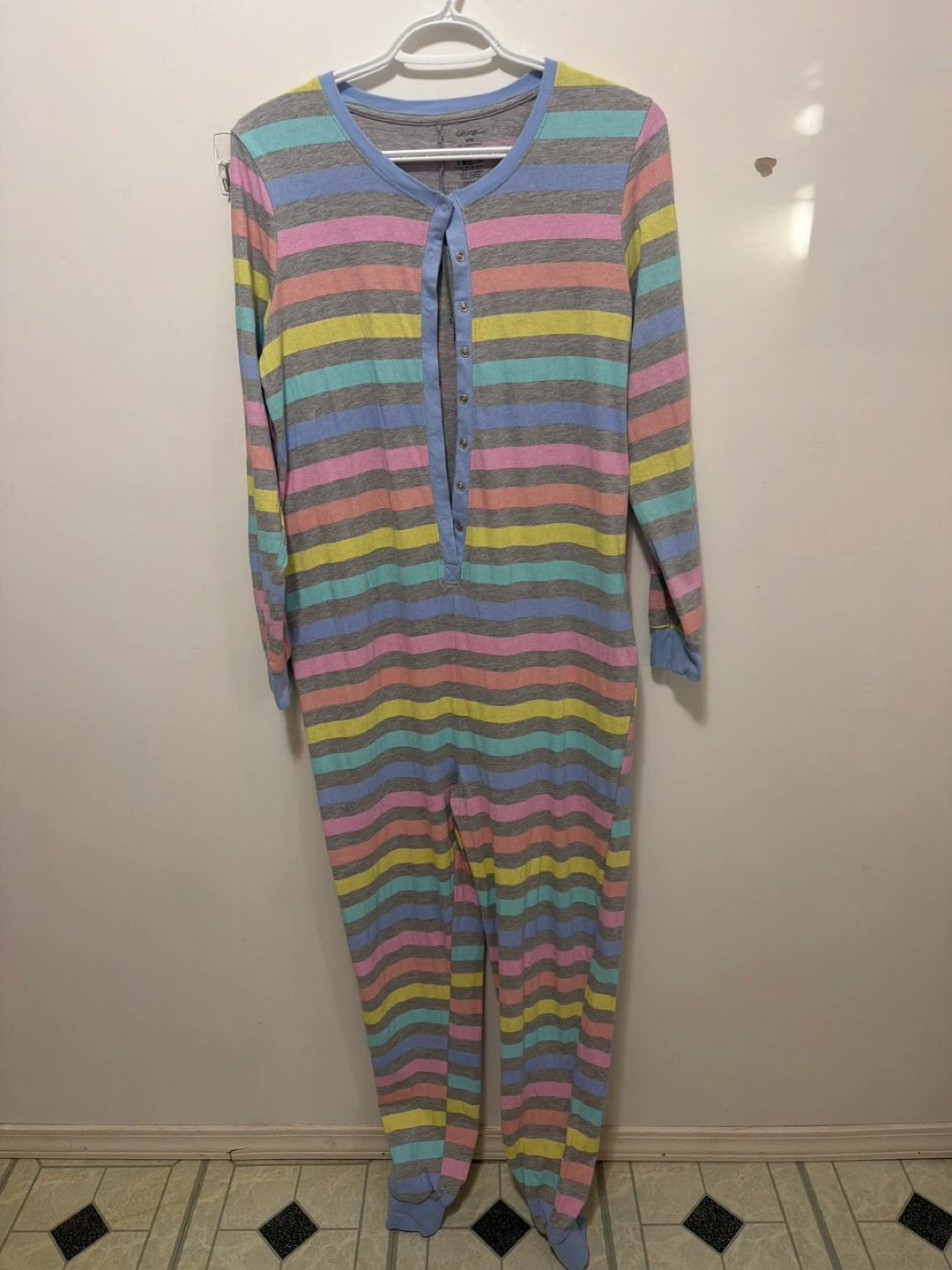 This is a brand new never warn freshly steamed George brand pajama sleepsuit with colourful stripes. It's a size medium (M/M). Made with 93% cotton and 7% viscose. Machine washable with like colours inside out.