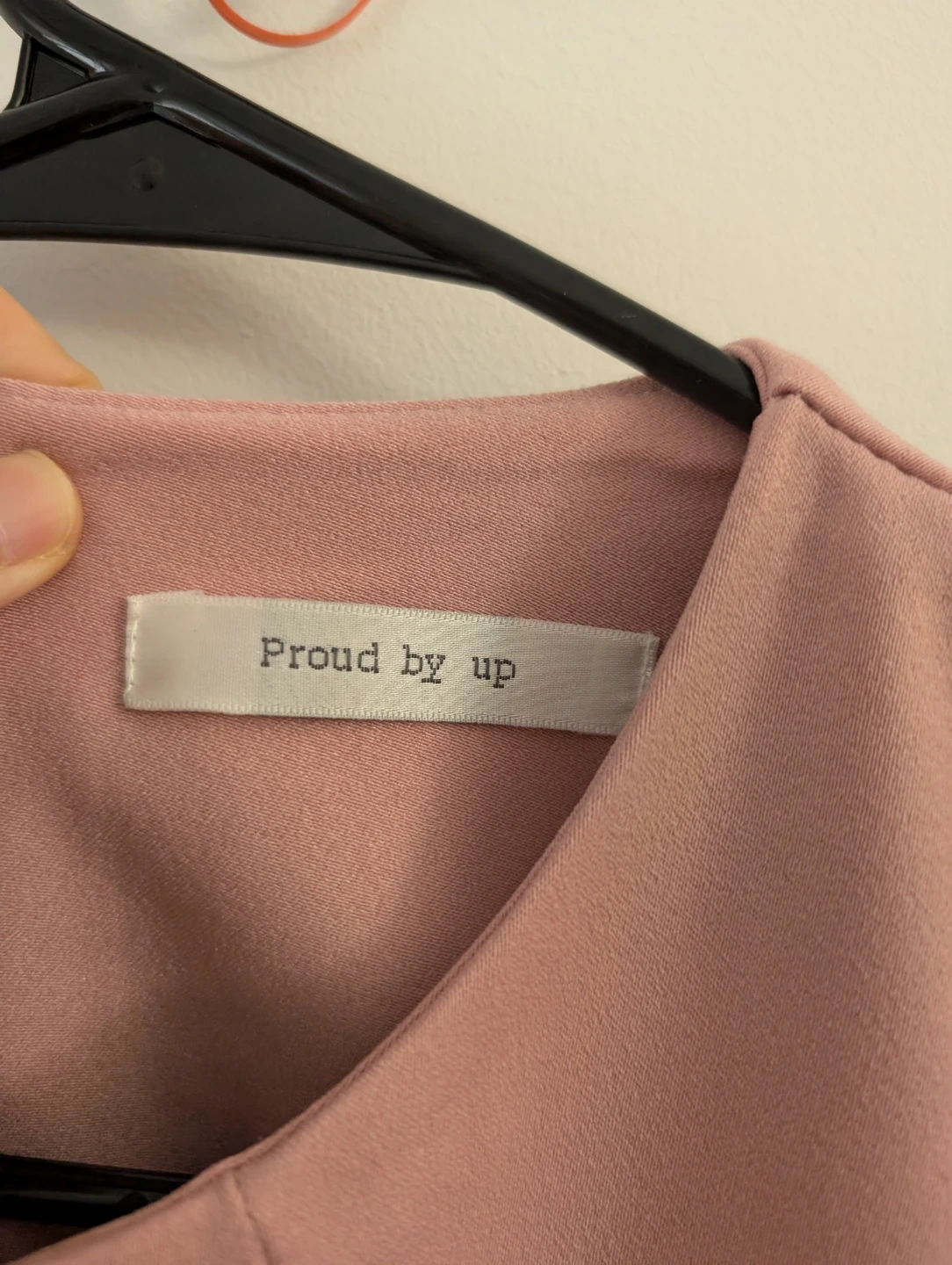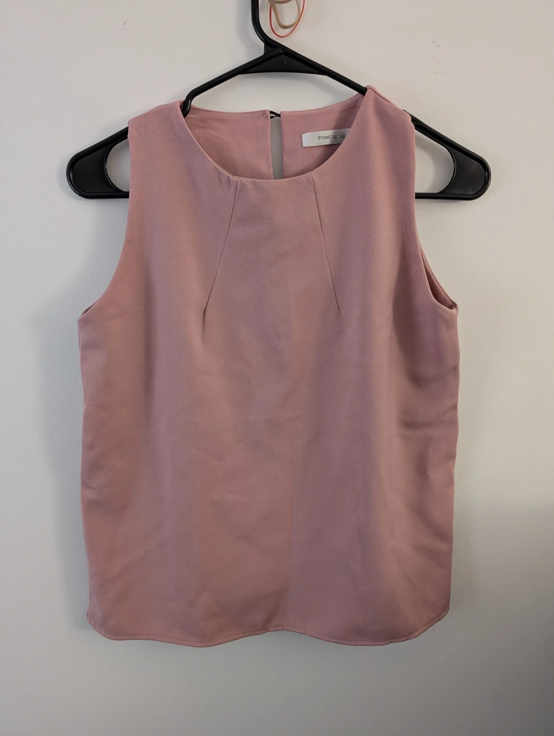 This is a pink sleeveless top from Proud by up. It's a size medium with a classic, sophisticated cut. The material feels smooth and drapes well. Office top Soft and comfortable to wear Fits S or M