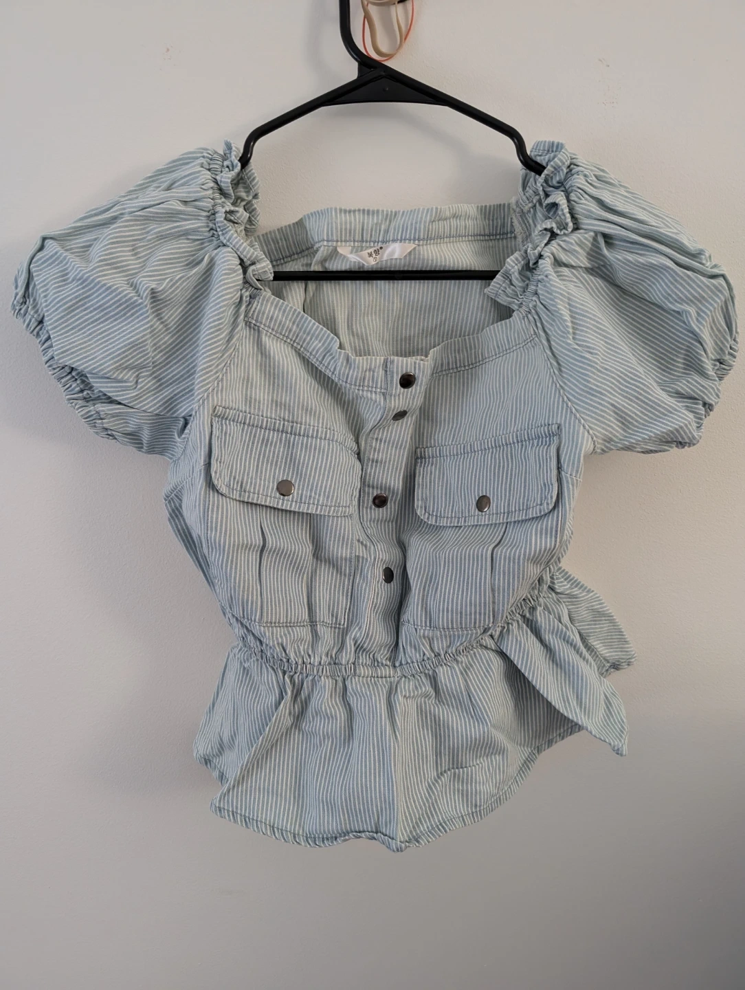 Cute light blue and white striped puff sleeve peplum top. It features a square neckline with button-up front and chest pockets. The cinched waist and ruffled hem add a flattering silhouette. Made from a soft fabric.