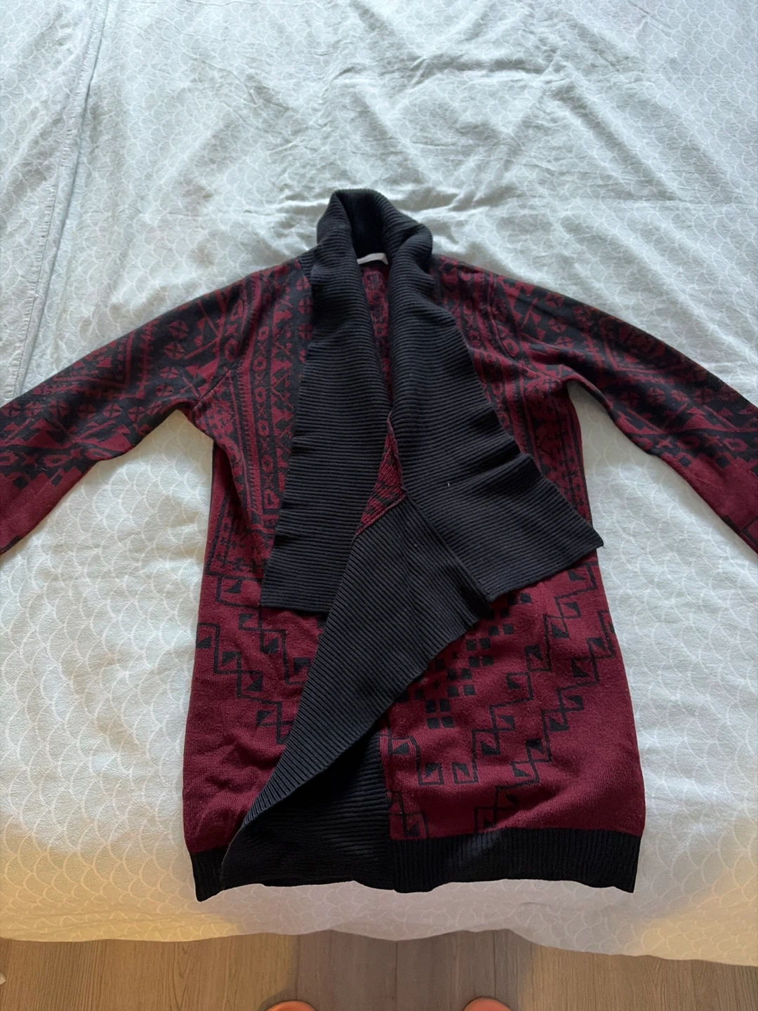 Cozy women's cardigan with a burgundy and black geometric pattern. It features a shawl collar and a relaxed fit. The material is knit blend, perfect for layering. This stylish cardigan is great for adding a touch of warmth and pattern to your outfit!