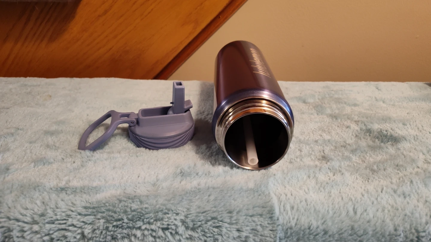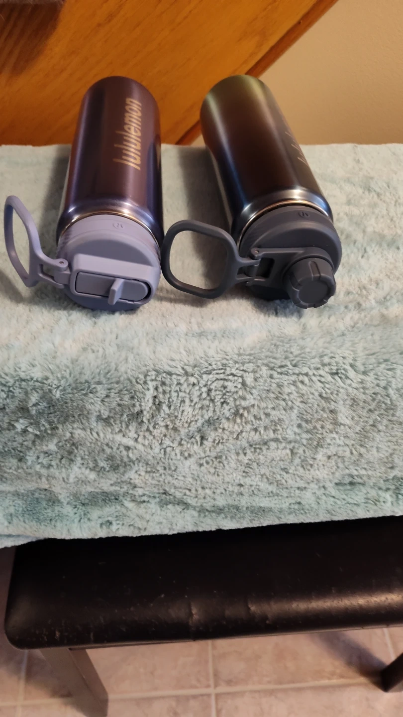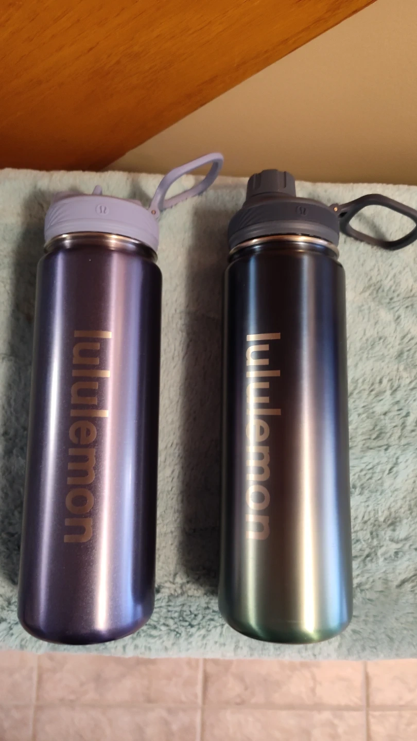 Lululemon water bottles, one purple is available and one green ombre bottle is Sold. One has a flip-top lids and carrying loops. Stainless steel construction. Asking $35. Obo each. The purple one retails for $48. plus. 24 oz bottle.