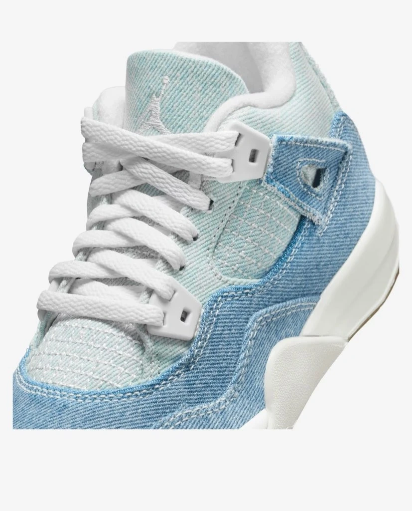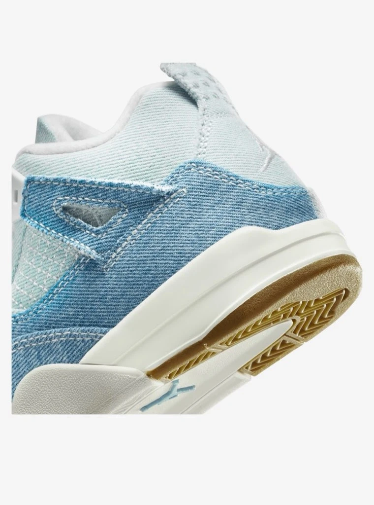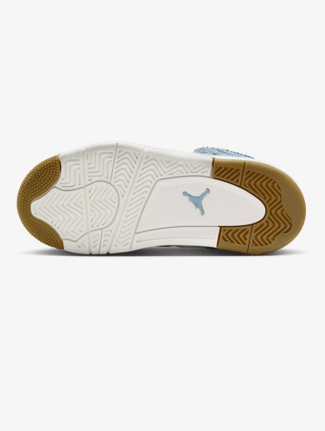 These Air Jordan 4s feature a washed denim upper with light blue and white accents. They have a rubber outsole with gum accents for traction. A must-have for any sneaker collector!