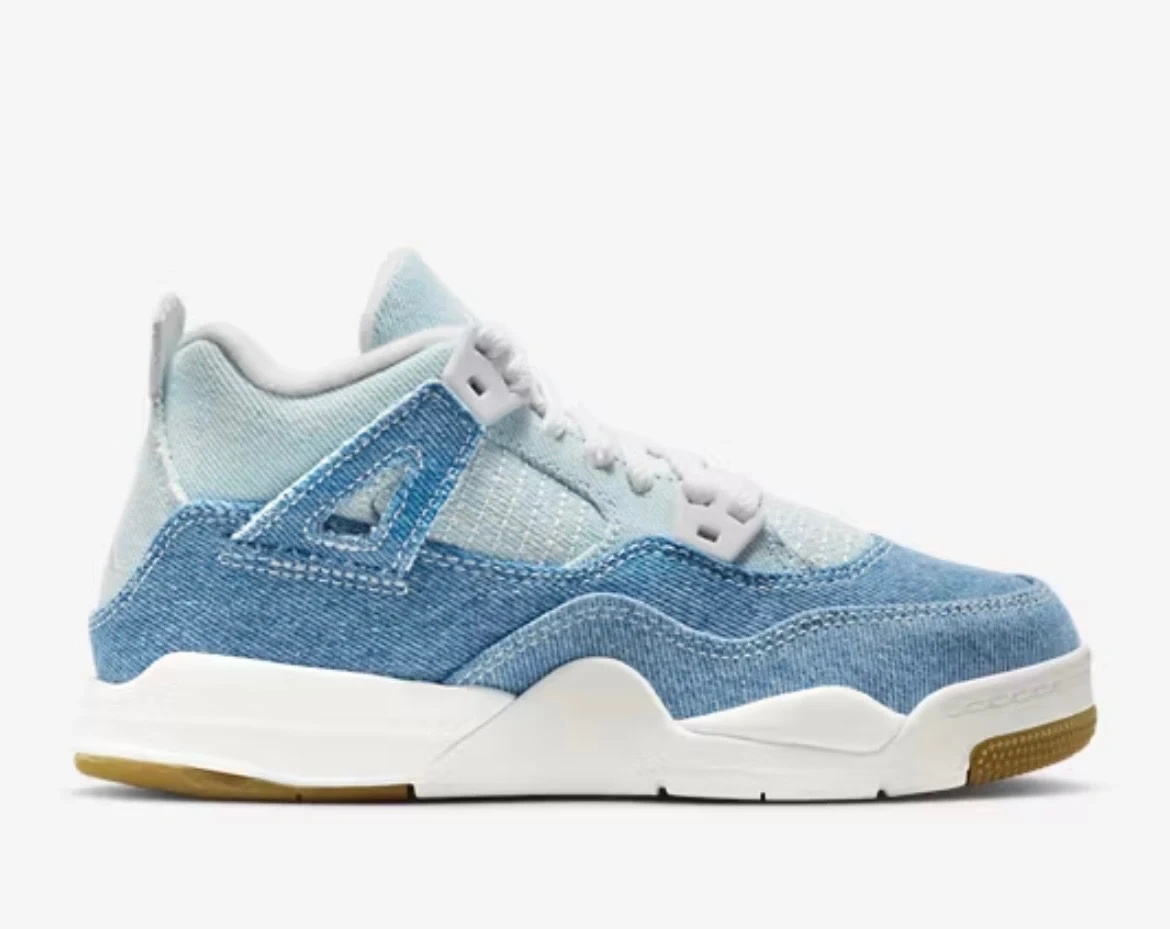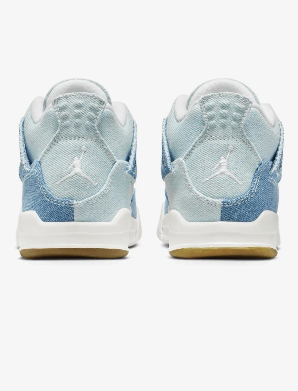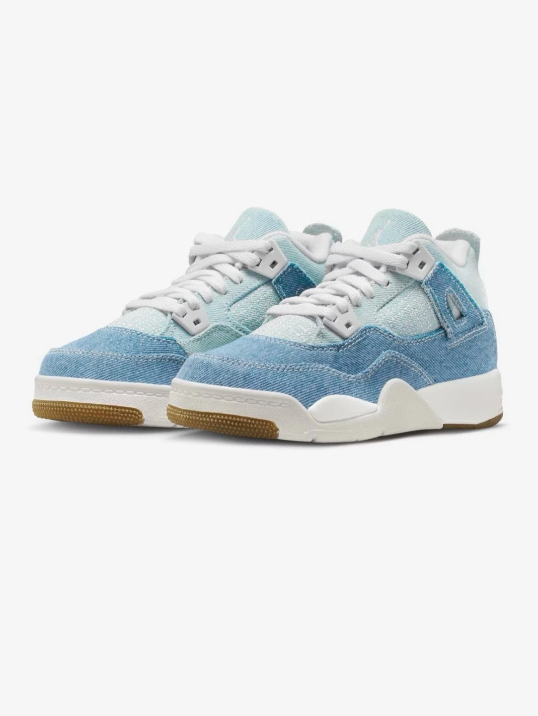 These Air Jordan 4s feature a washed denim upper with light blue and white accents. They have a rubber outsole with gum accents for traction. A must-have for any sneaker collector!
