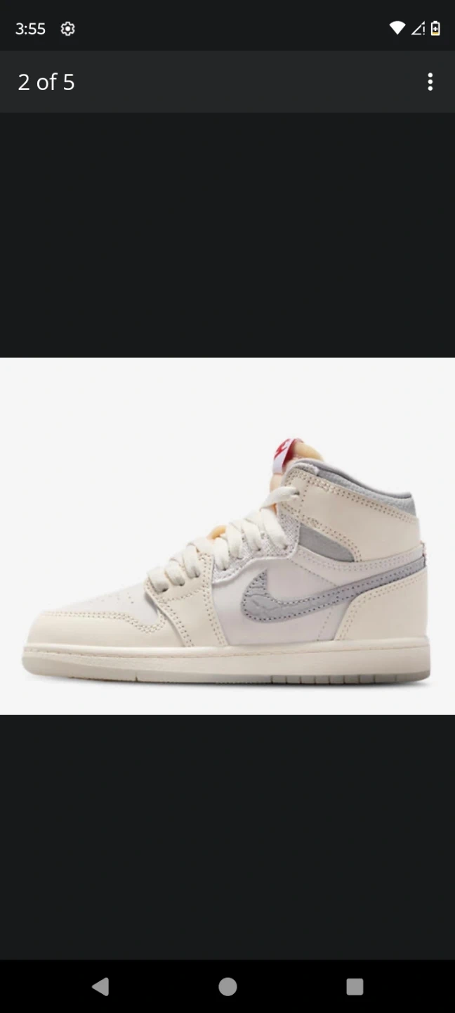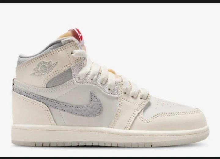 Classic Nike Air Jordan 1 Mid SE sneakers in a cream and grey colorway. These shoes feature a mid-top silhouette and a durable rubber sole. Leather and synthetic upper with textile lining.