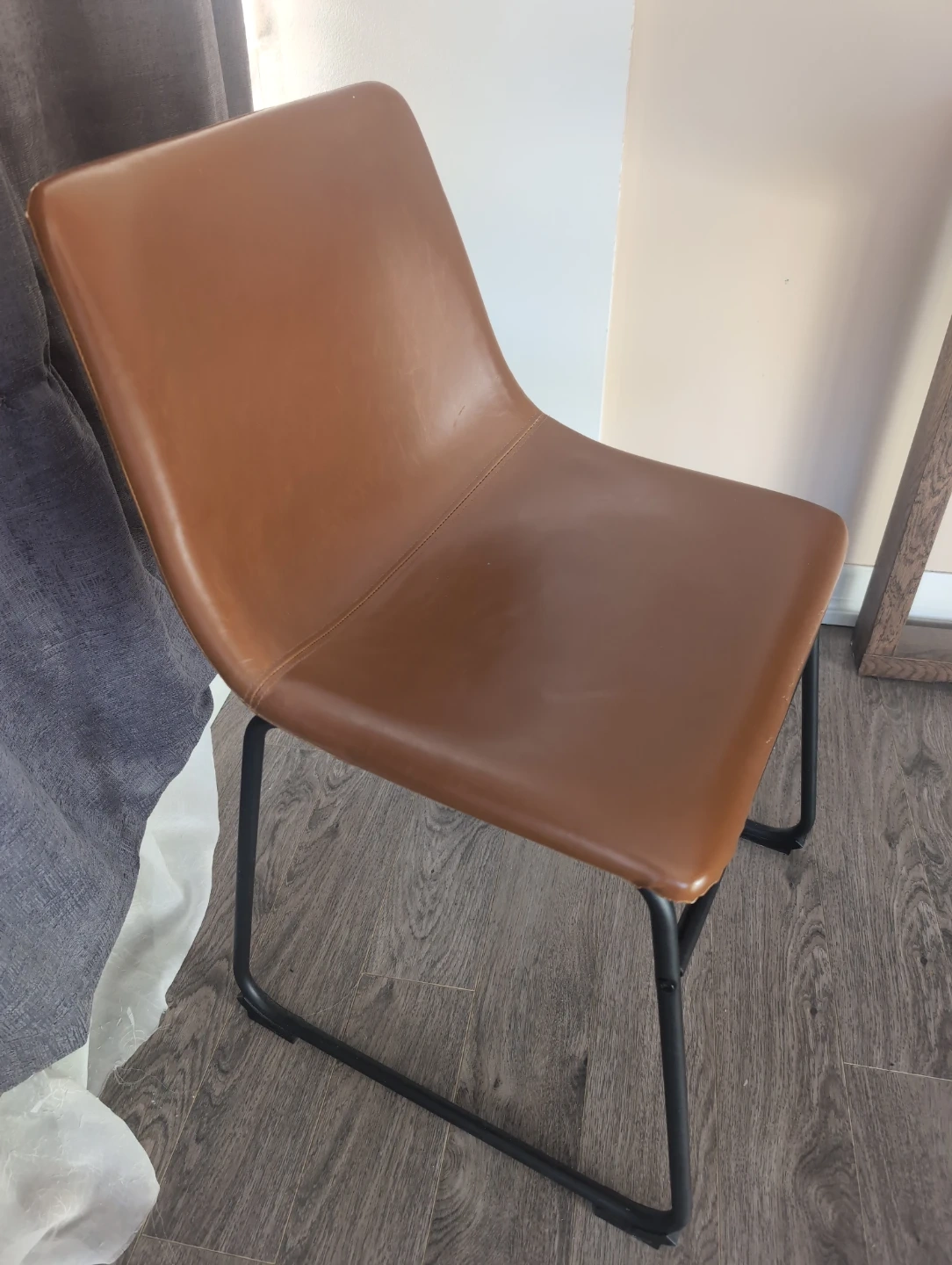 Modern dining chair upholstered in a rich brown faux leather. It features a comfortable seat with subtle stitching detail and a sturdy black metal frame. This chair's sleek design makes it a versatile addition to any dining space.