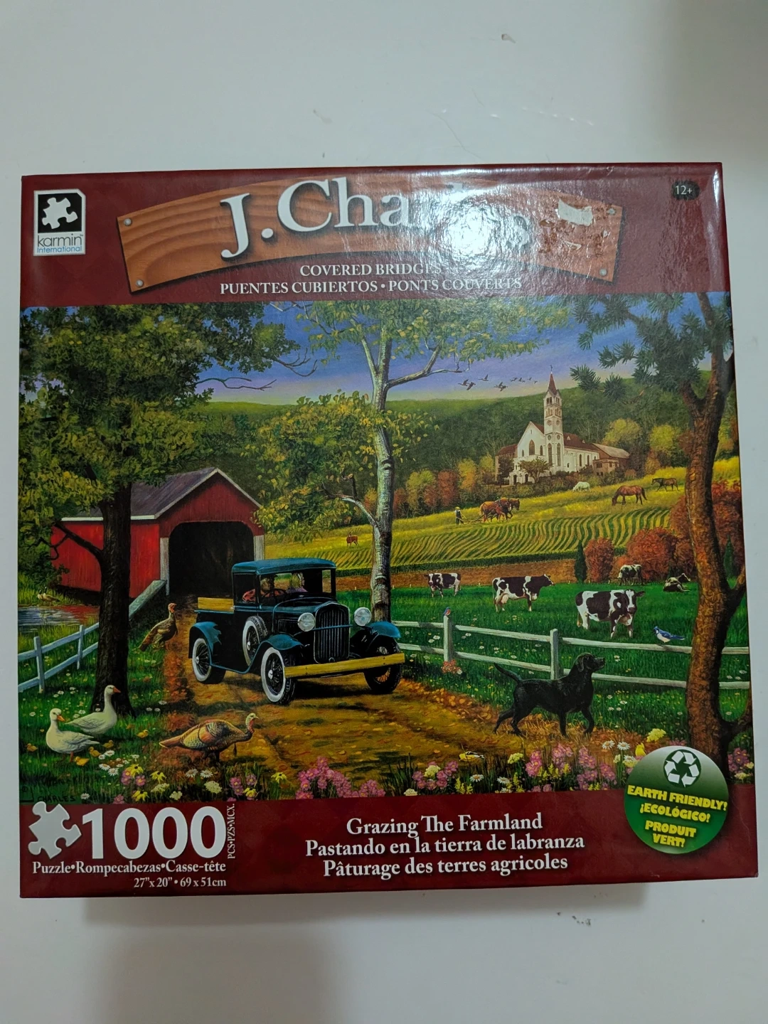 J. Charle's "Grazing The Farmland" puzzle features 1000 pieces. It's a covered bridges scene. The finished puzzle size is 27" x 20" or 69cm x 51cm. Suitable for ages 12+.
