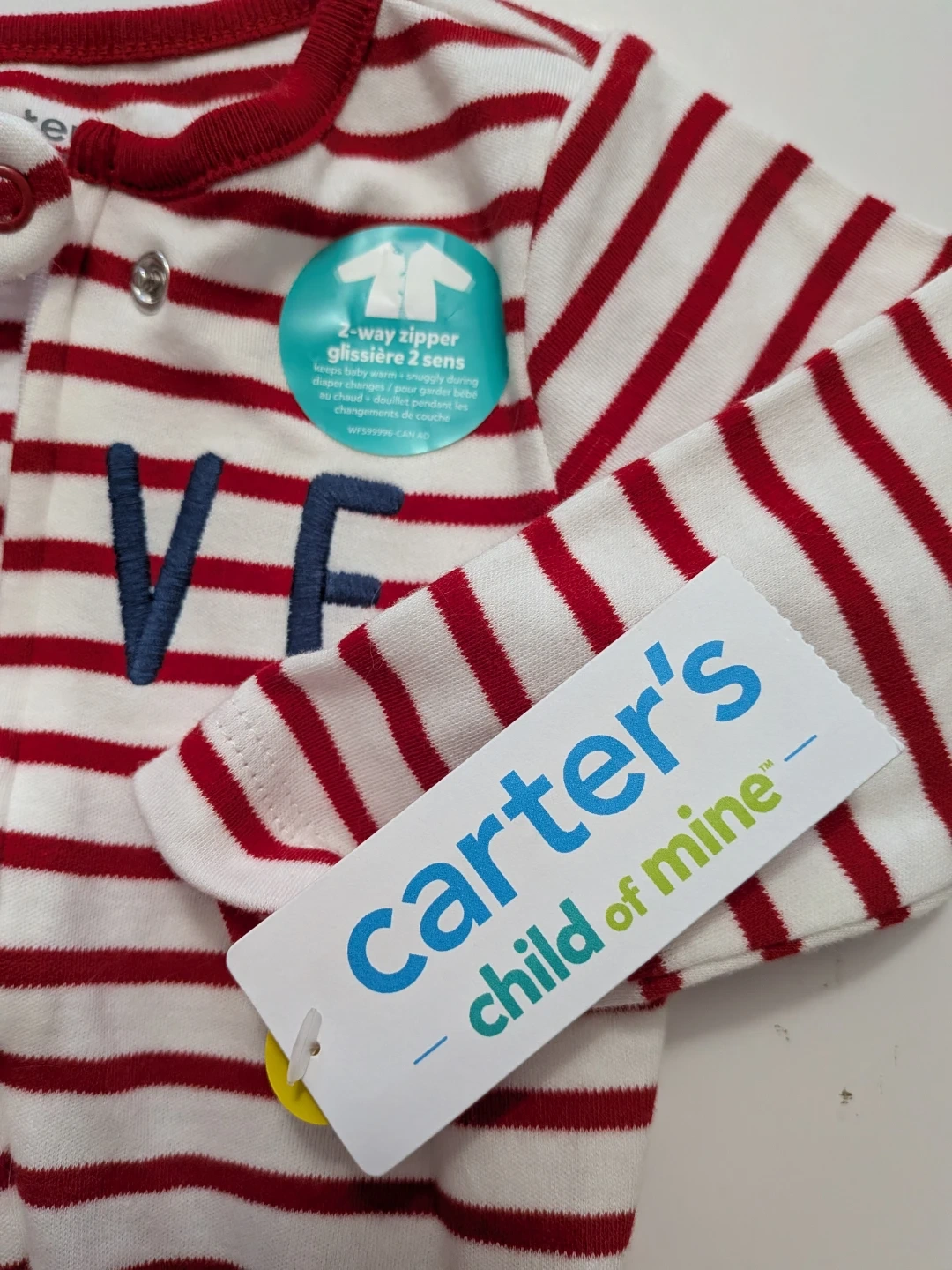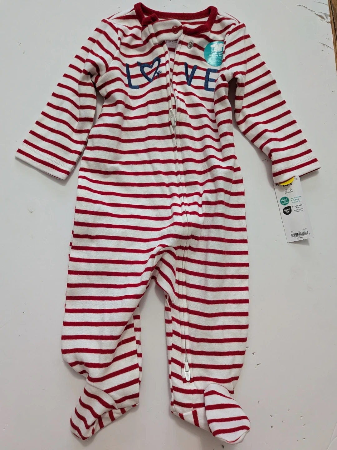 NEW This Carter's Child of Mine sleepsuit is for babies and features a red and white stripe pattern. It has a "LOVE" graphic across the chest and a 2-way zipper for easy changes. This is a size 3 to 6 months.