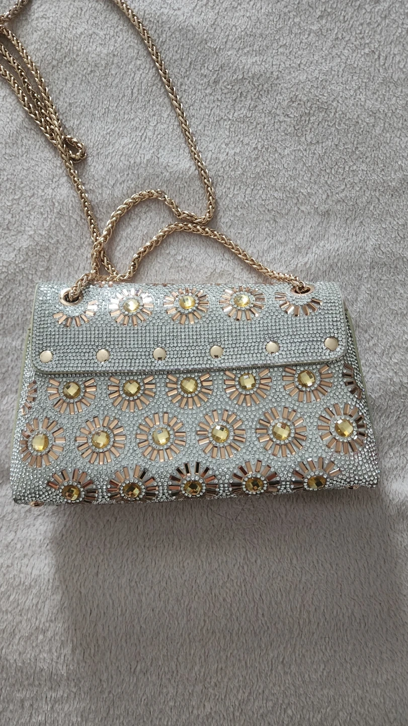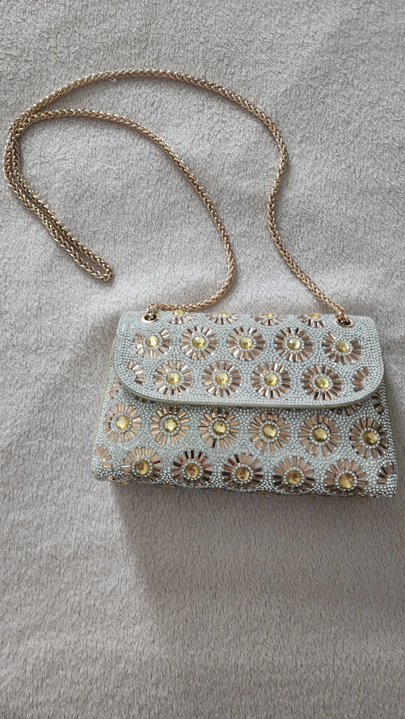 Embellished clutch handbag with a decorative floral design. Features a gold chain strap and a secure snap closure. Interior has a zippered pocket for essentials.