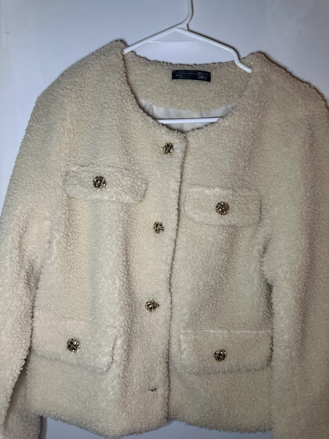 Cozy cream-colored teddy fleece jacket from Dazy. It features elegant gold button closures and decorative pocket details. Material is soft fleece.