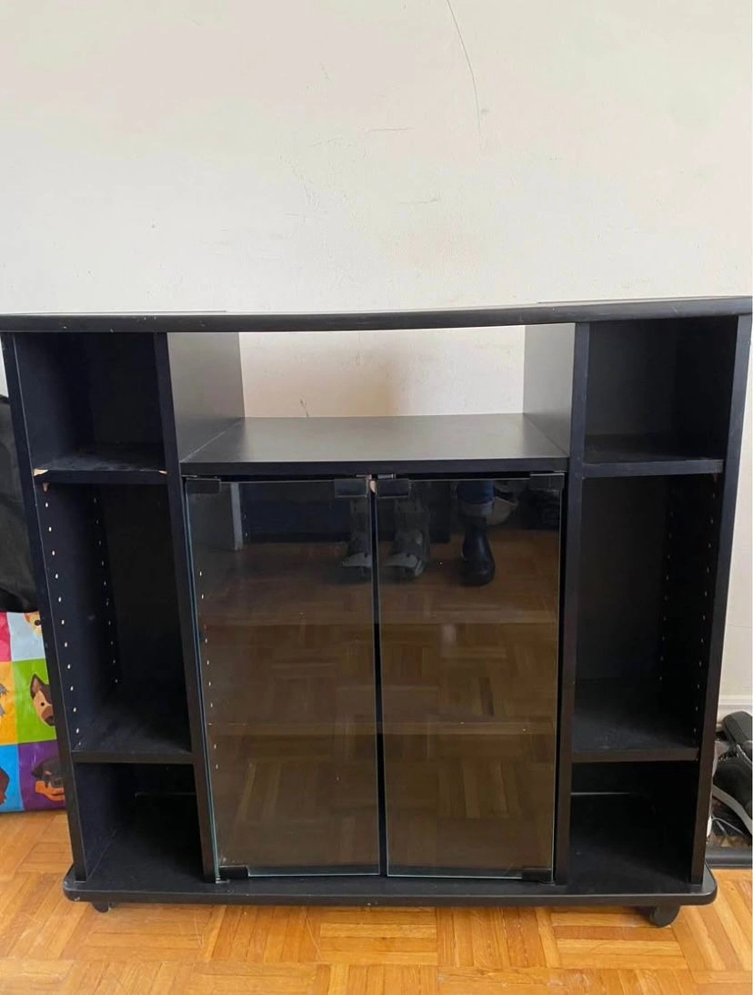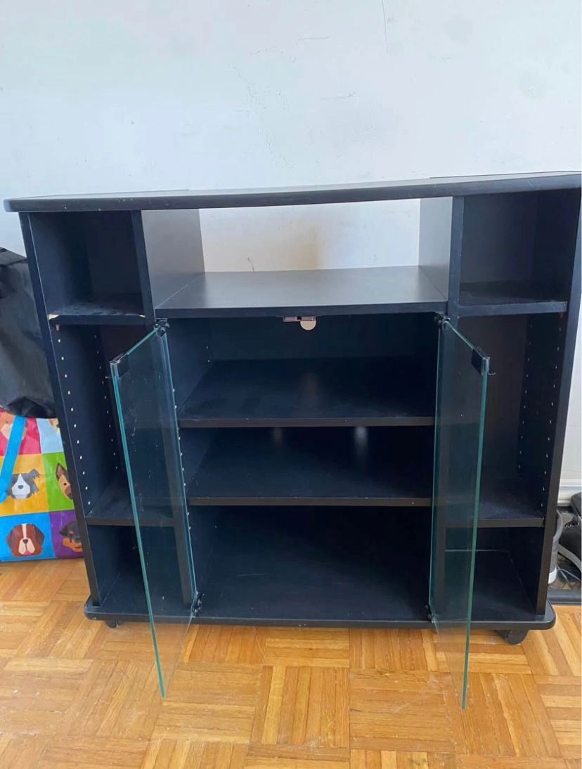 This black media console features glass doors on the front centre section for storage. It has multiple shelves on the sides and an open top shelf. The unit has wheels for easy moving.