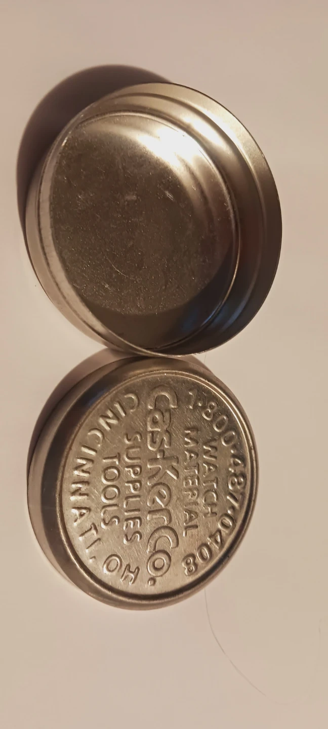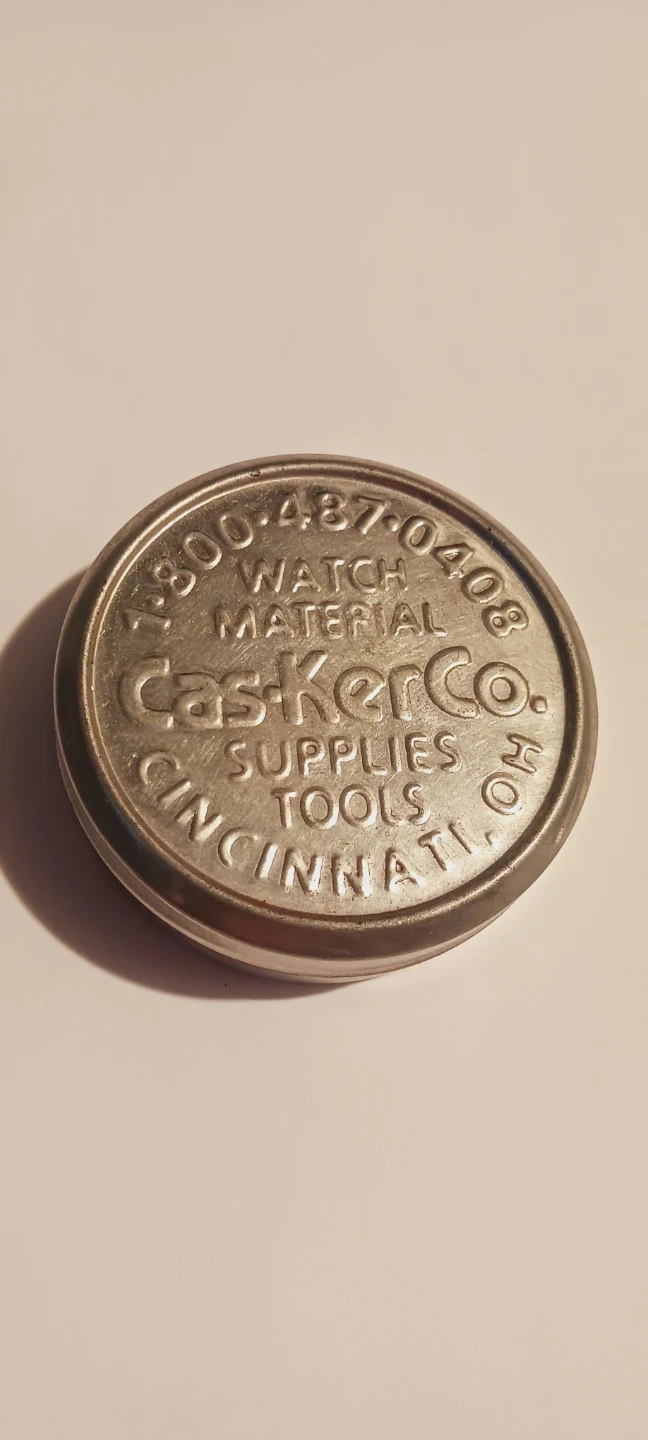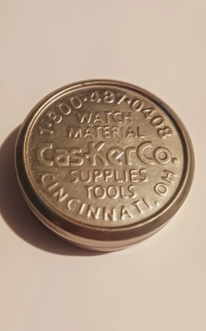 Collectible Vintage Miniature "Cas-Ker Co." tin for watch material, supplies, and tools. Its empty collectible pill box/ Trinket Box. It's made of metal and features embossed text with a phone number and location. Useful for storing small watchmaking parts or tools. ITS EMPTY MINIATURE TIN BOX. 2" Diameter. Excellent condition. ALL MY PRICES ARE NEGOTIABLE !! It's size of a pill box.