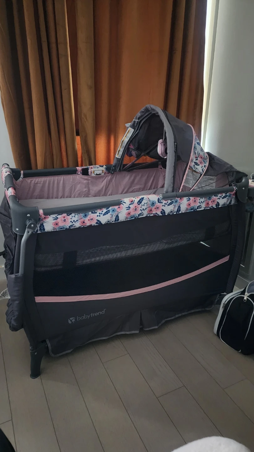 This Baby Trend playard comes with a bassinet convertible to playpen . It's grey with pink and floral accents. Includes a canopy and toy arch. Great for keeping your little one comfortable and safe!