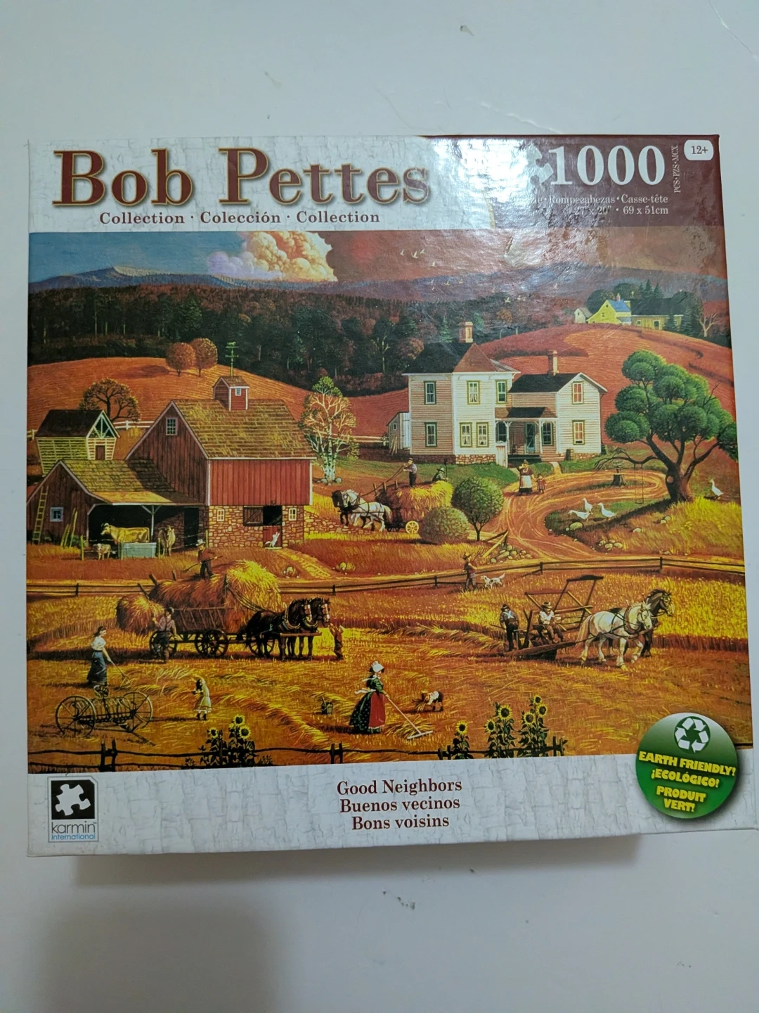 This is a 1000-piece jigsaw puzzle by Bob Pettes, titled "Good Neighbors". It measures 69 x 51cm when assembled. It's suitable for ages 12 and up. This puzzle is Earth Friendly!