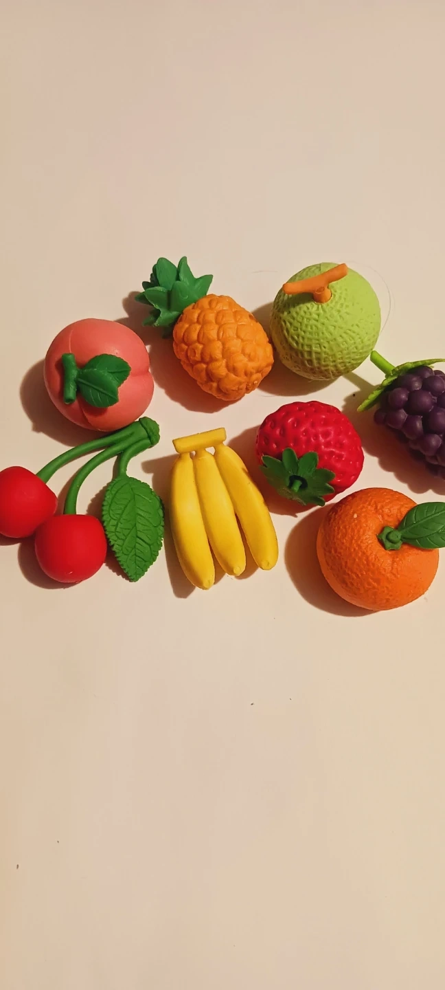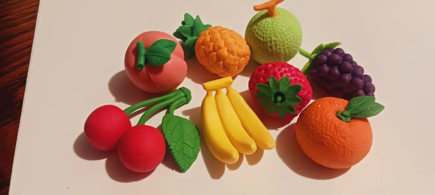 New !! JAPANESE FRUIT SHAPED PENCIL ERASERS. This set includes a variety of cute fruit-shaped erasers. You'll find cherries, bananas, an orange, a strawberry, a peach, a pineapple, a melon, and grapes. They're perfect for back-to-school or as a fun addition to any pencil case! New !! ALL MY PRICES ARE NEGOTIABLE !!